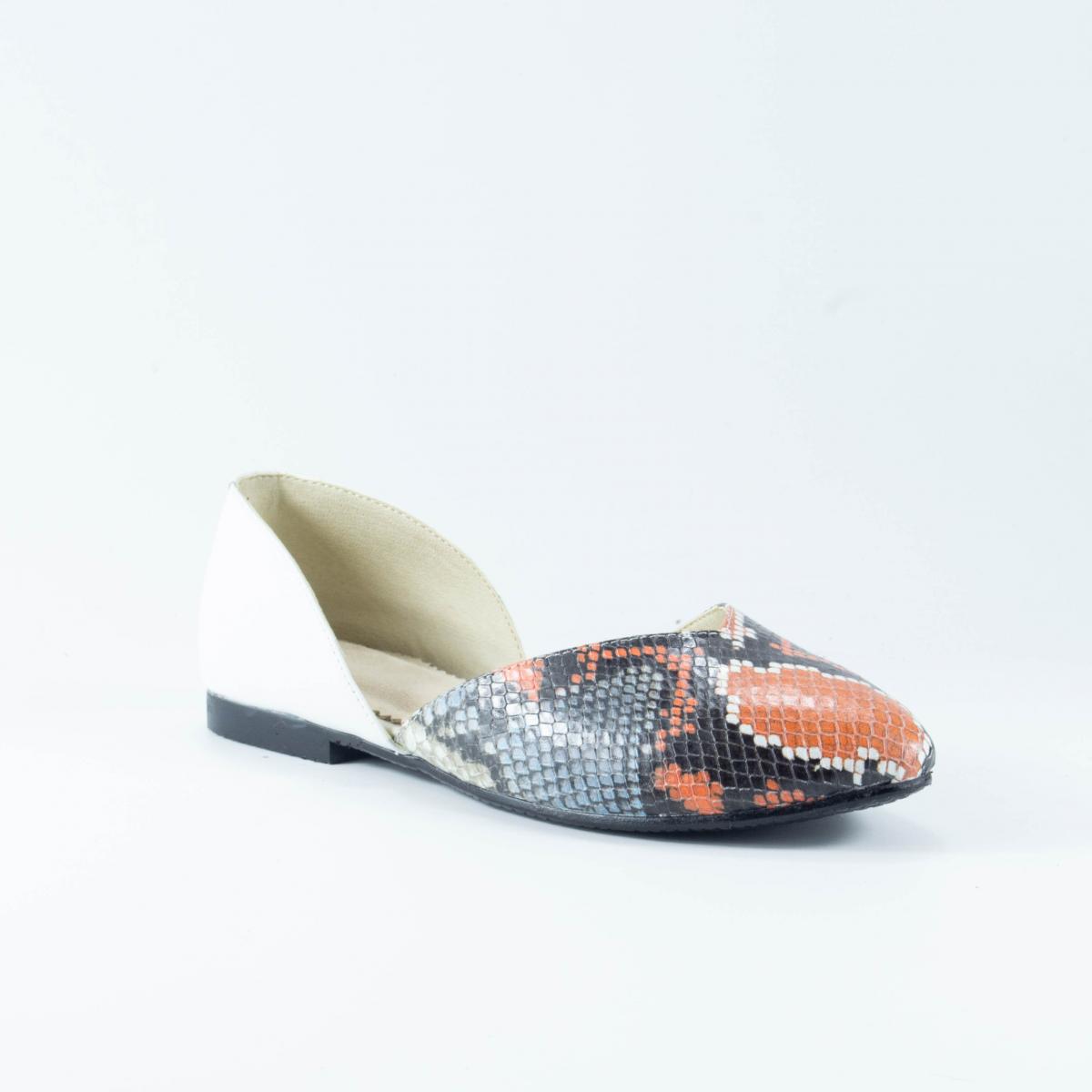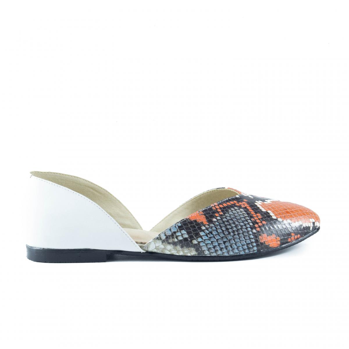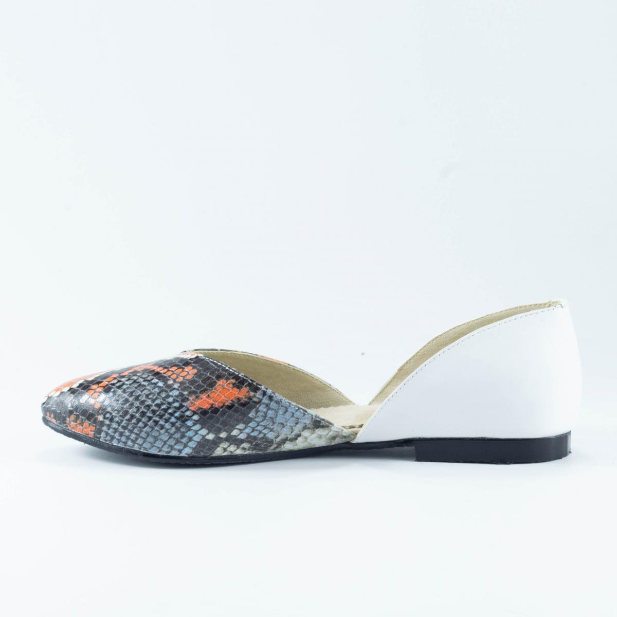 Balerini flexibili din piele naturală, alb cu imitație reptilă, cu vârf ascuțit, ce pot fi purtați împreună cu ținute casual, office, dar nu numai.