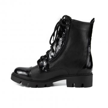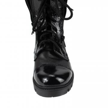 Bocanci de damă, realizați din piele naturală combinată cu piele lac, cu talpă ușoară, căptușeală caldă, ce pot fi purtați la ținute casual, dar nu numai.