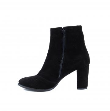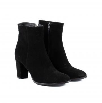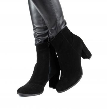 Botine clasice si elegante, realizate din piele naturala velur negru, cu toc gros, ce pot fi purtate la tinute clasice, smart-casual, office, dar nu numai.