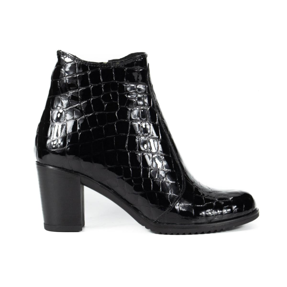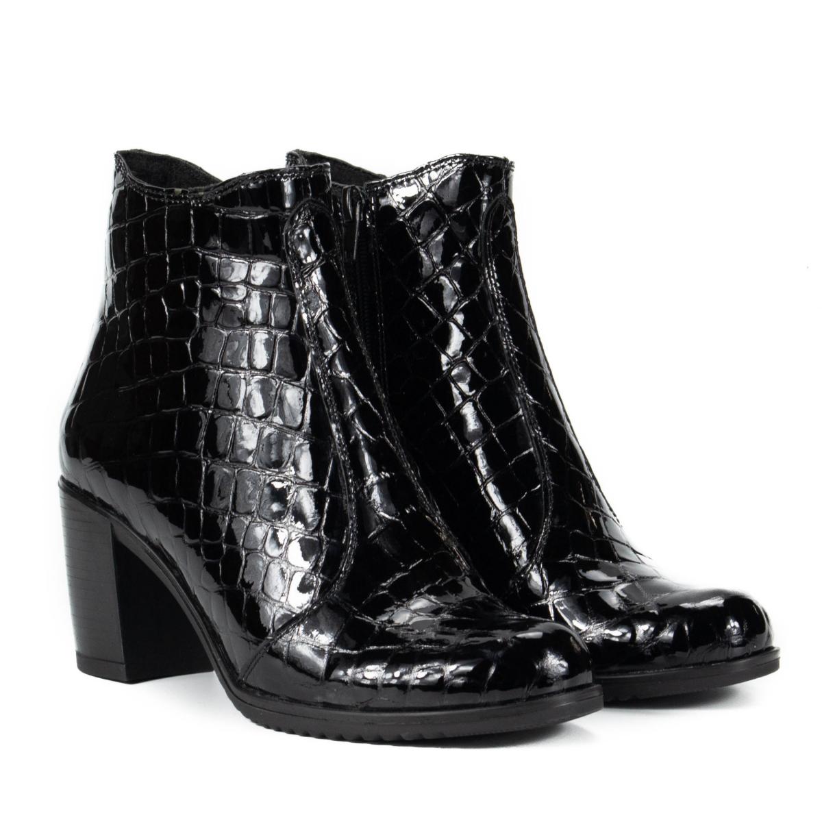 Botine clasice și elegante, realizate din piele naturală tip crocodil, cu toc gros, ce pot fi purtate la ținute clasice, smart-casual, office, dar nu numai.