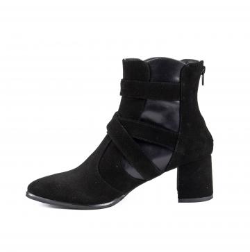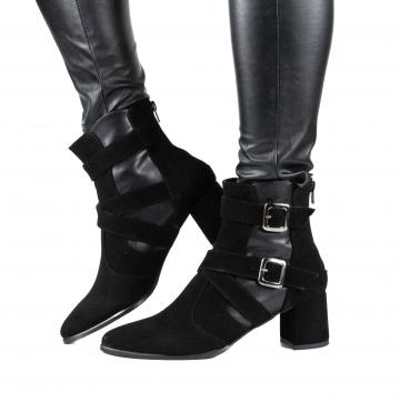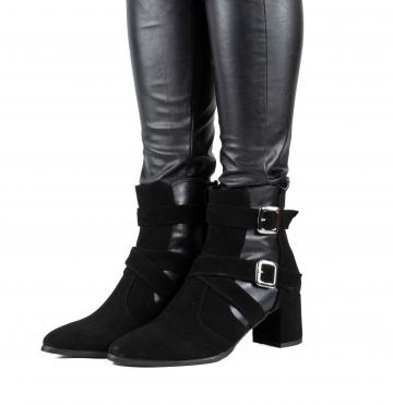 Botine negre cu accesorii metalice, cu toc gros, realizate din piele naturala velur combinata cu piele box, ce pot fi purtate la tinute elegante, smart-casual, office, dar nu numai.