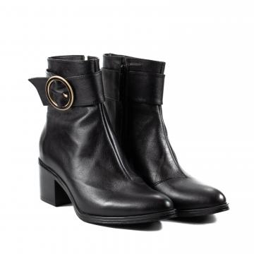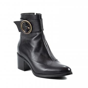Botine clasice realizate din piele naturala, cu toc gros, imbracat, ce pot fi purtate la tinute office, smart-casual sau chiar elegante.