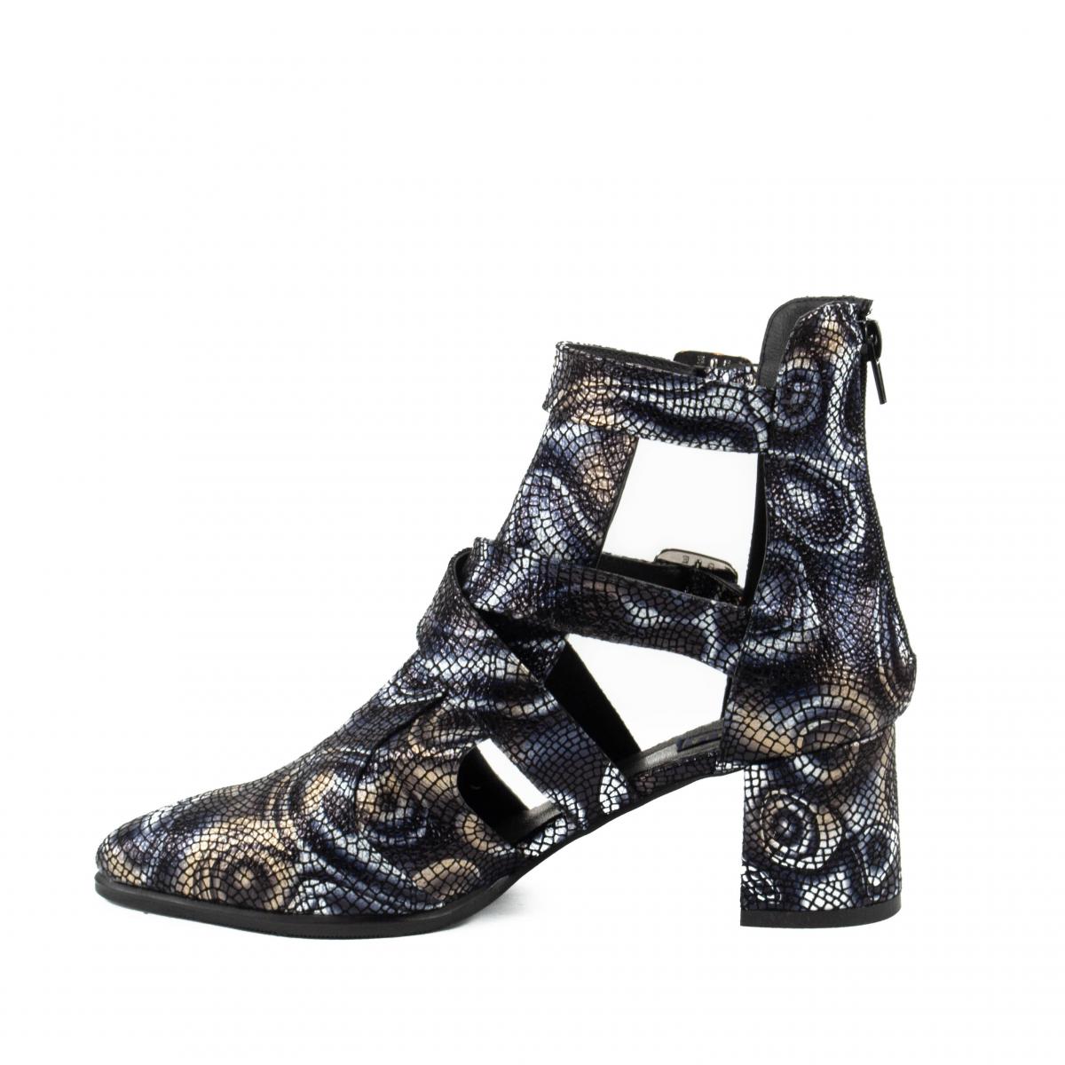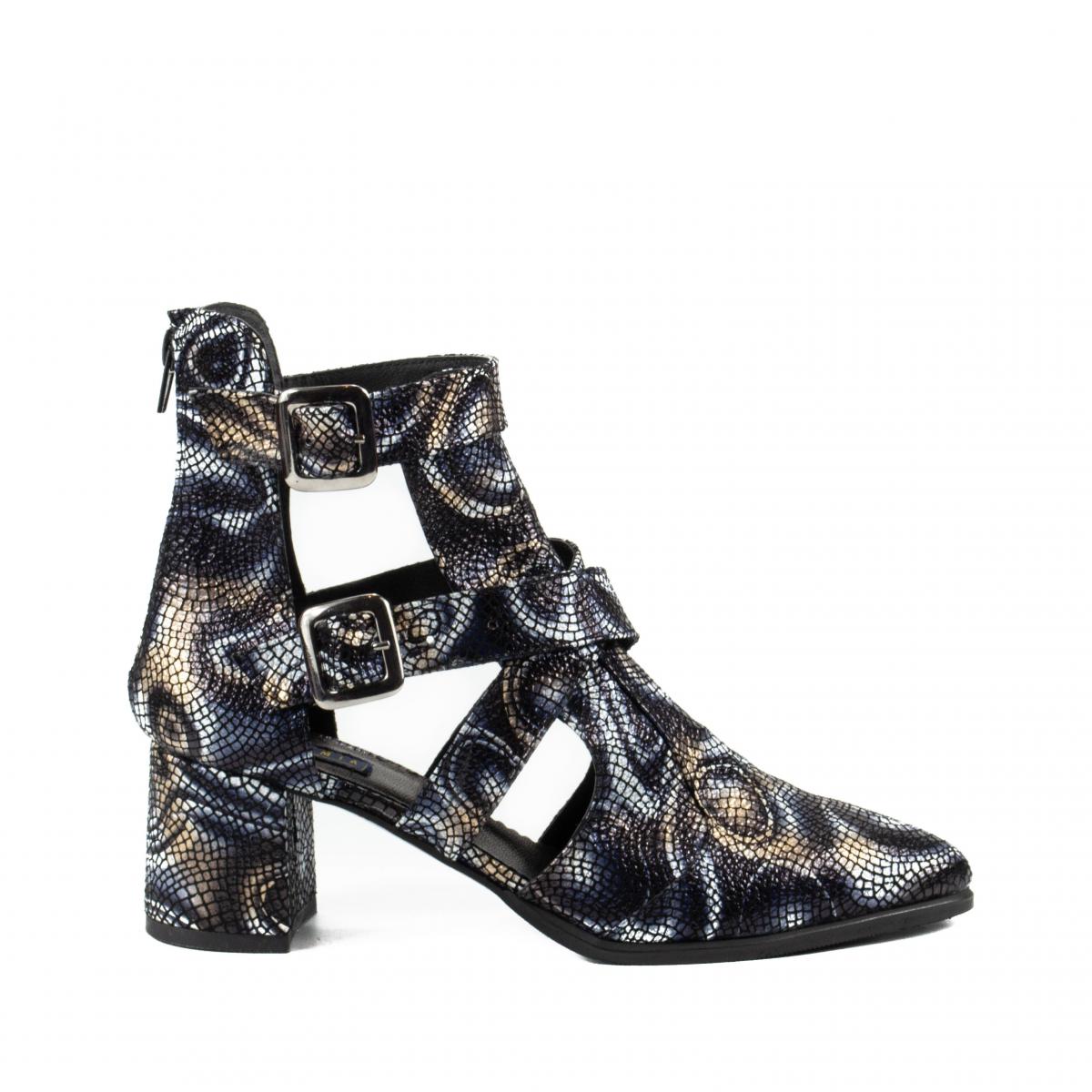 Botine decupate cu accesorii metalice, cu toc gros, realizate din piele naturala texturata si sidefata pe calapod italienesc, ce pot fi purtate la tinute elegante, smart-casual, office, dar nu numai.