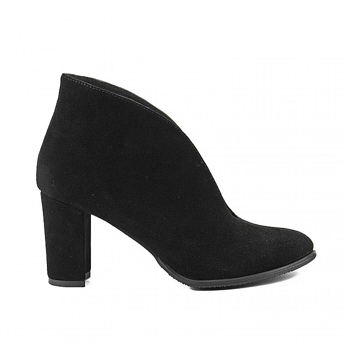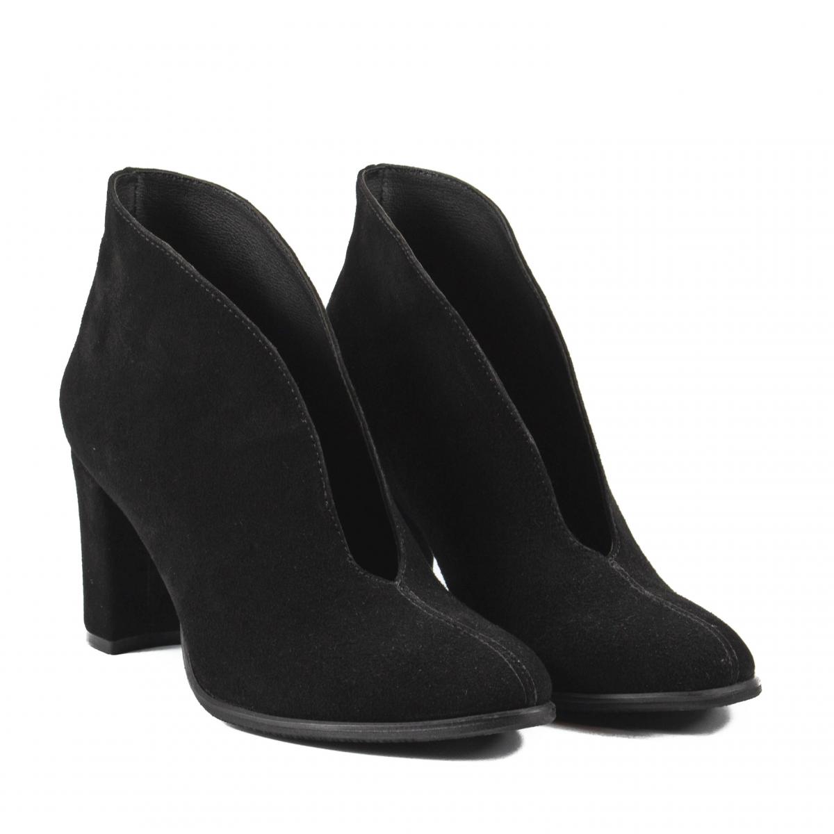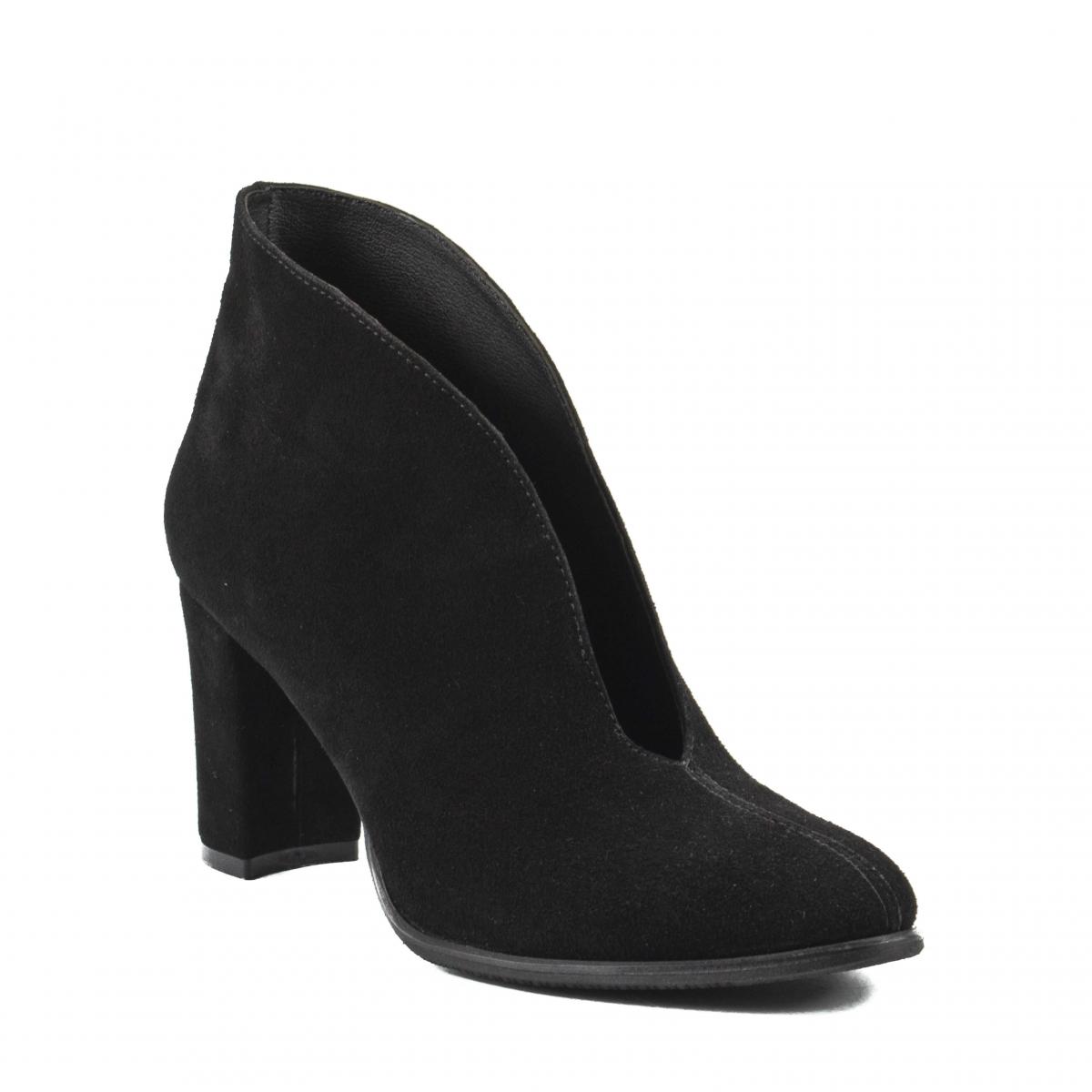 Botine decupate, clasice si elegante, realizate din piele naturala moale, cu toc gros, imbracat, ce pot fi purtate la tinute office, smart-casual sau chiar elegante.