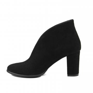 Botine decupate, clasice si elegante, realizate din piele naturala moale, cu toc gros, imbracat, ce pot fi purtate la tinute office, smart-casual sau chiar elegante.