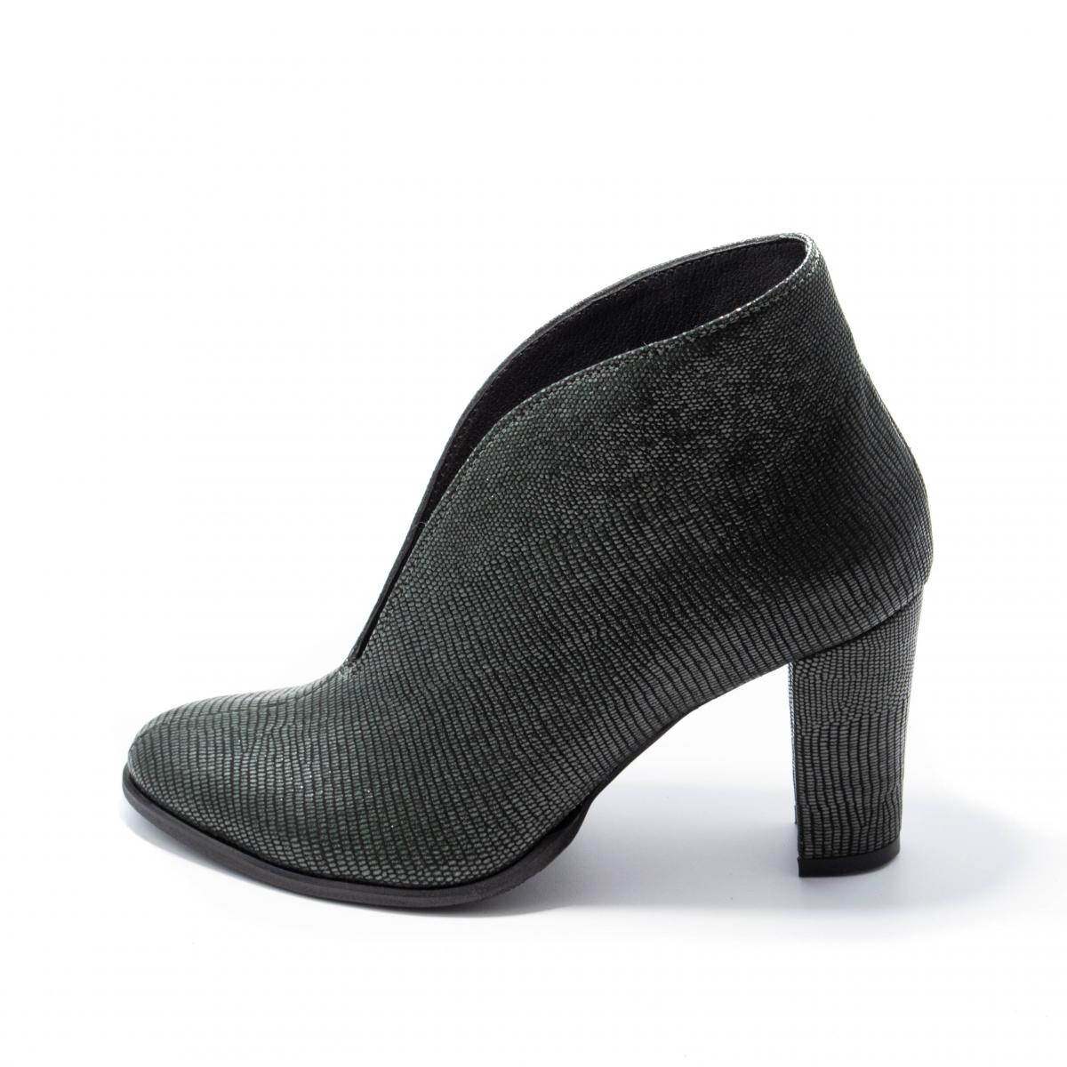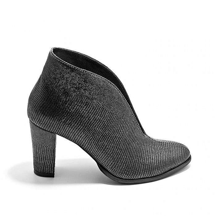 Botine decupate, clasice și elegante, realizate din piele naturală moale tip reptilă, cu toc gros, îmbrăcat, ce pot fi purtate la ținute casual, office, dar nu numai.