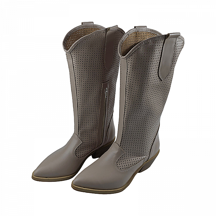 Cizme ciocate de vara perforate, realizate din piele naturala bej, foarte usoare si confortabile, cu toc inaltime 7 cm, ce pot fi purtate la tinute casual, smart-casual, dar nu numai.