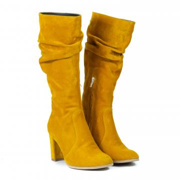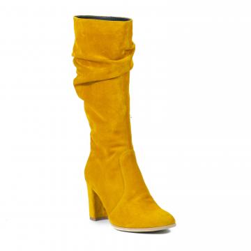 Cizme din piele naturală velur, fronsate, cu toc și căptușeală caldă, ce pot fi purtate la ținute elegante, smart-casual sau office.