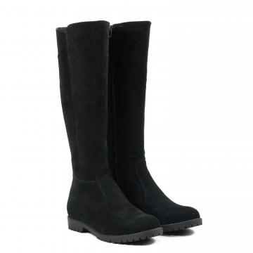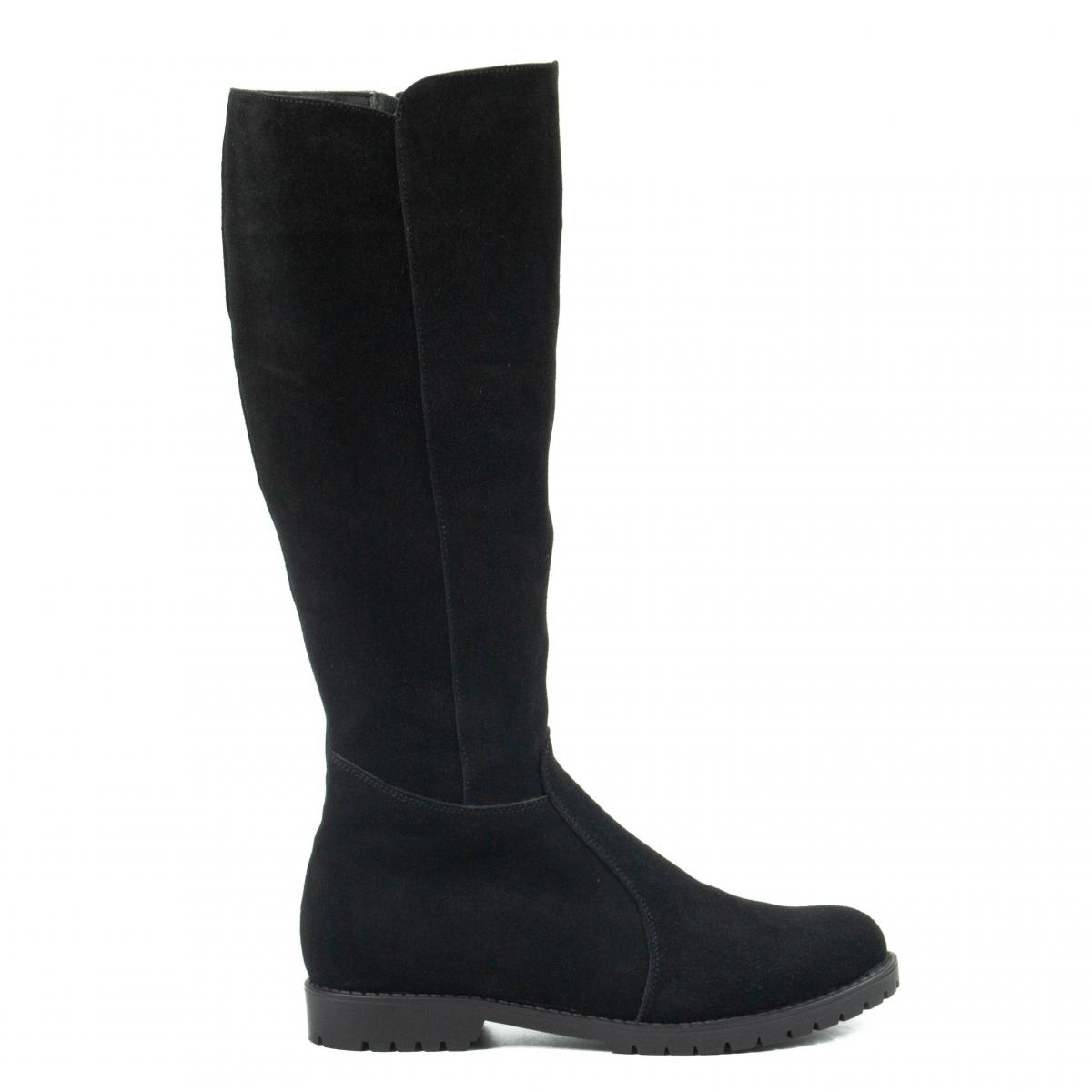 Cizme inalte din piele naturala velur negru, cu talpa joasa, antiderapanta si captuseala calda, ideale pentru vremea rece si uscata.