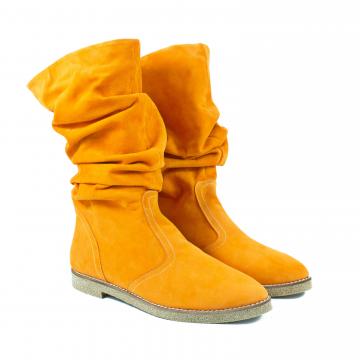 Cizme medii din piele naturala velur galben-mustar, fronsate, fara inchidere, cu talpa joasa, antiderapanta, ce pot fi purtate la tinute casual, smart-casual, dar nu numai.