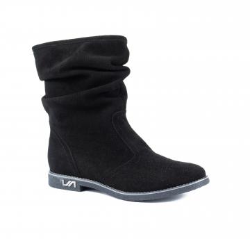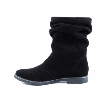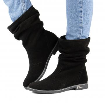 Cizme scurte din piele naturala velur negru, fronsate, fara inchidere, cu talpa joasa, ce pot fi purtate la tinute casual, smart-casual, dar nu numai.