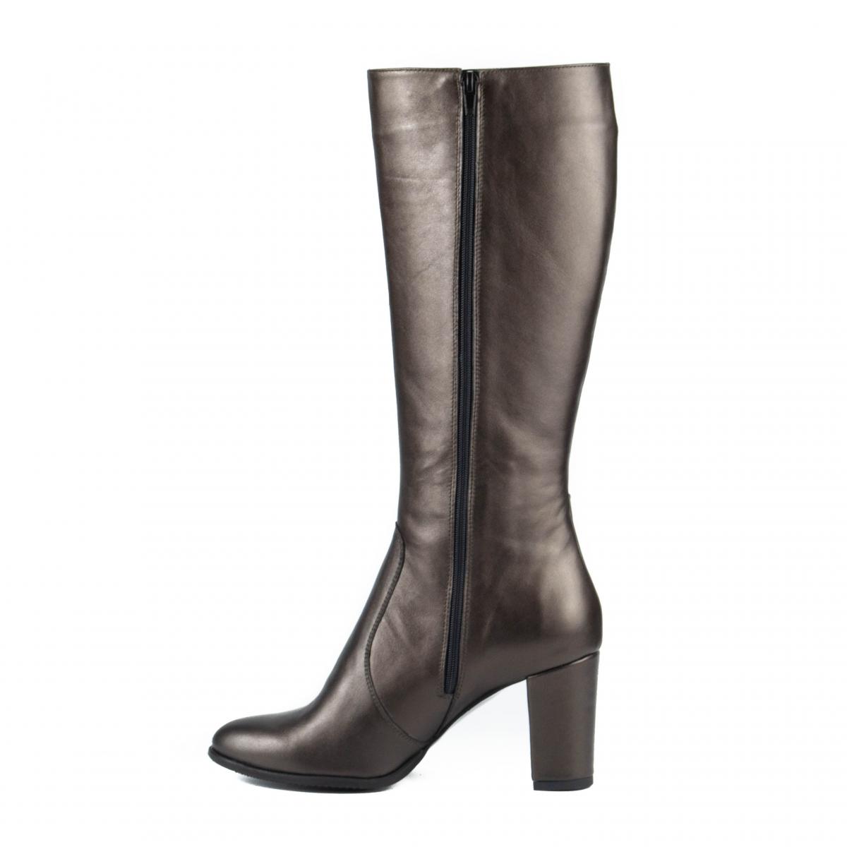 Cizme înalte din piele naturală bronz, cu toc, călduroase, ce pot fi purtate la ținute elegante, smart-casual sau office.