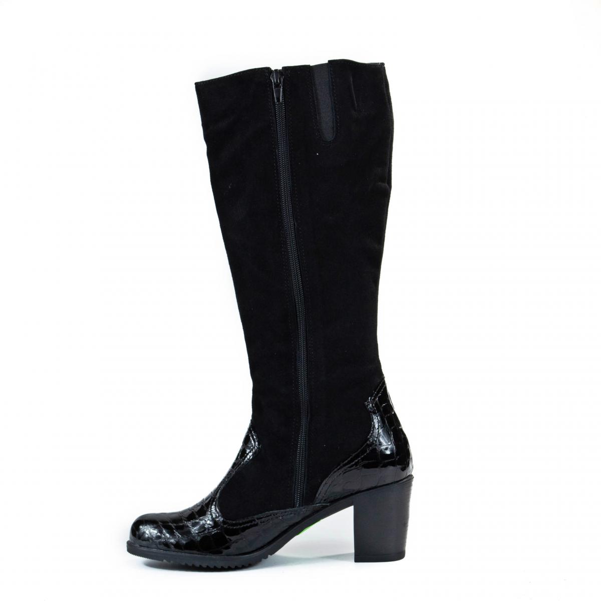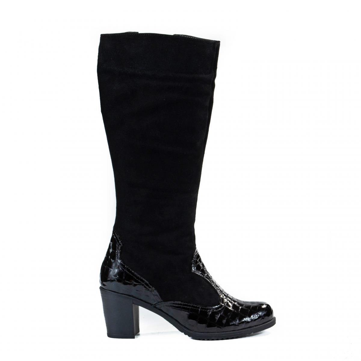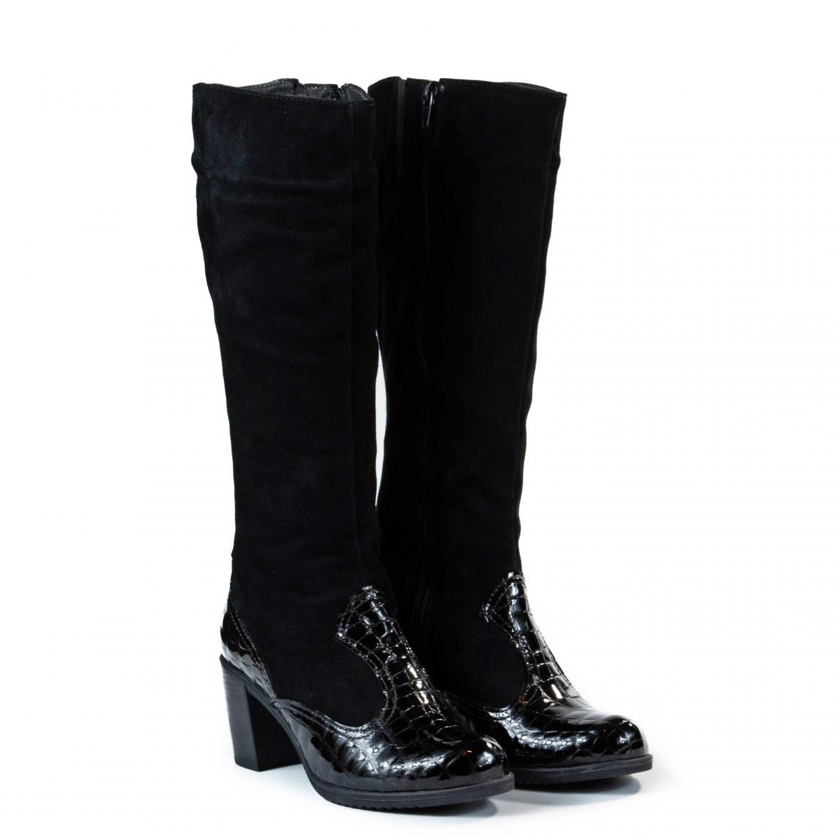Cizme înalte din piele naturală velur și piele imitație de crocodil, cu toc și căptușeală caldă, ideale pentru vremea rece, la ținute smart-casual, office sau elegante.