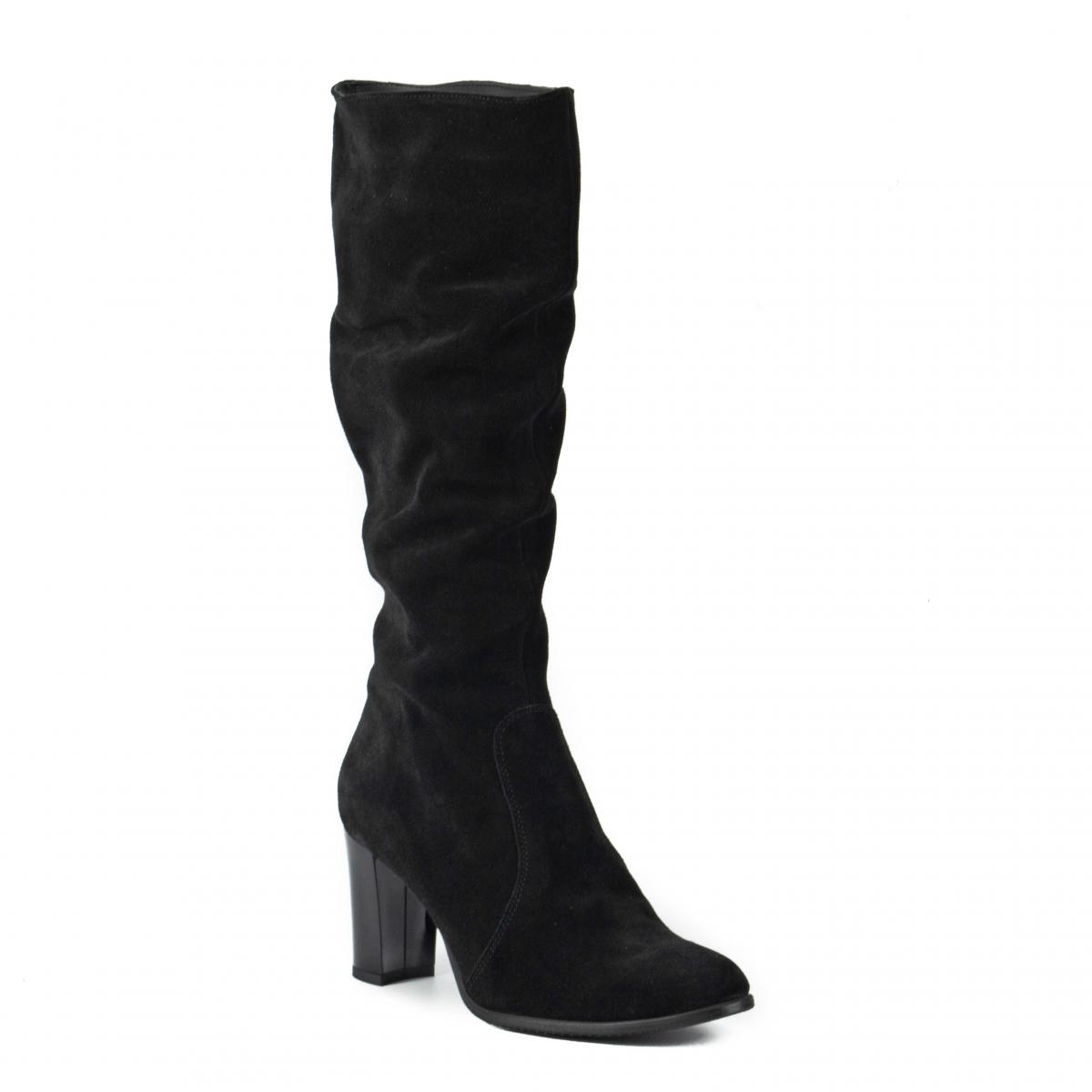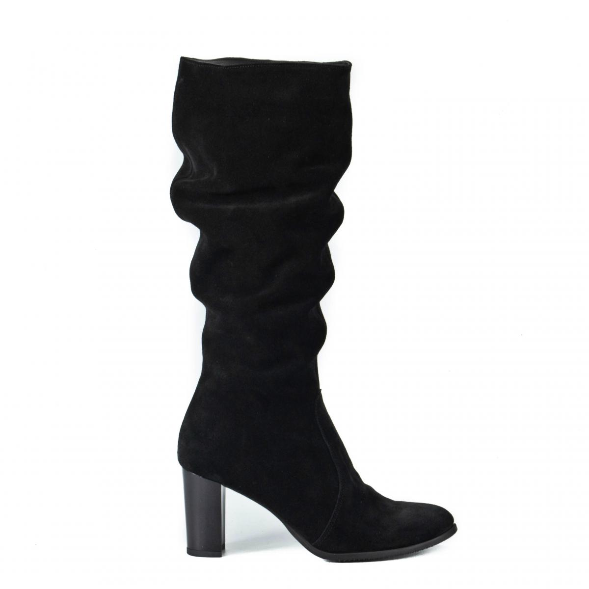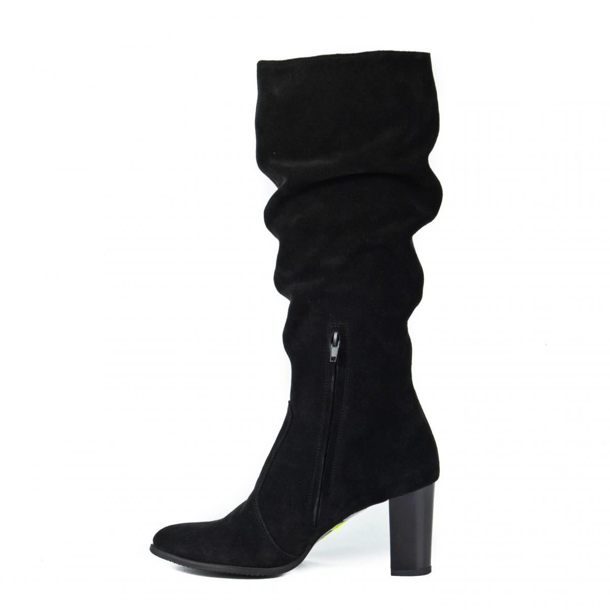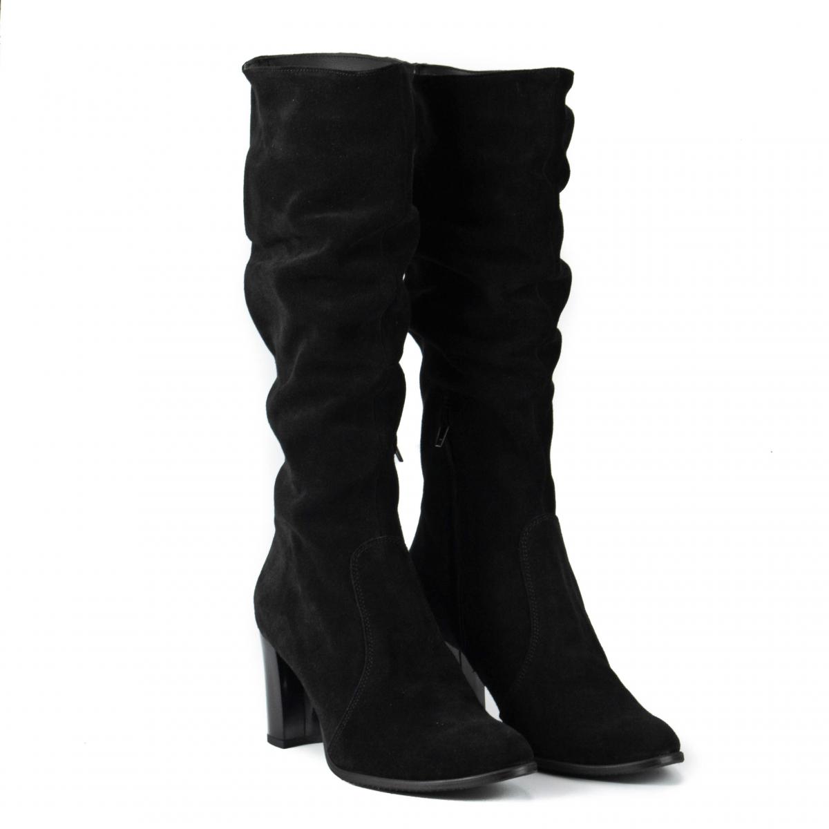 Cizme din piele naturală velur, fronsate, cu toc și căptușeală caldă, ce pot fi purtate la ținute elegante, smart-casual sau office.