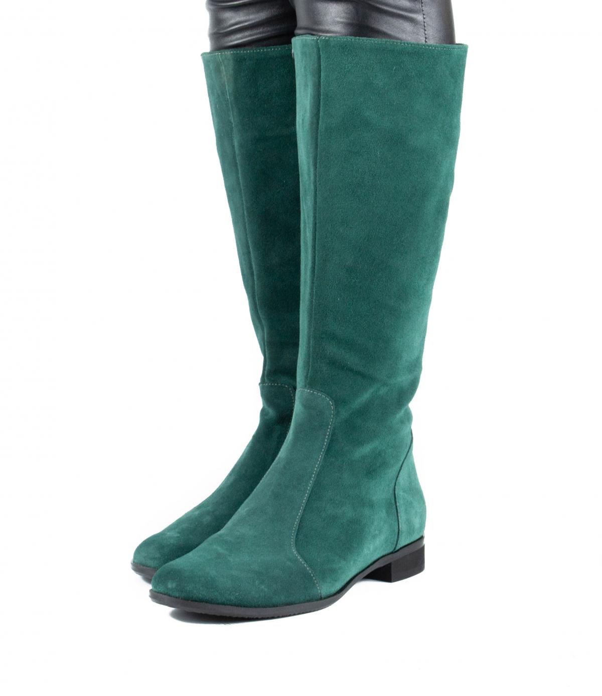 Cizme inalte din piele naturala velur verde, cu talpa joasa si captuseala calda, ideale pentru vremea rece si uscata.