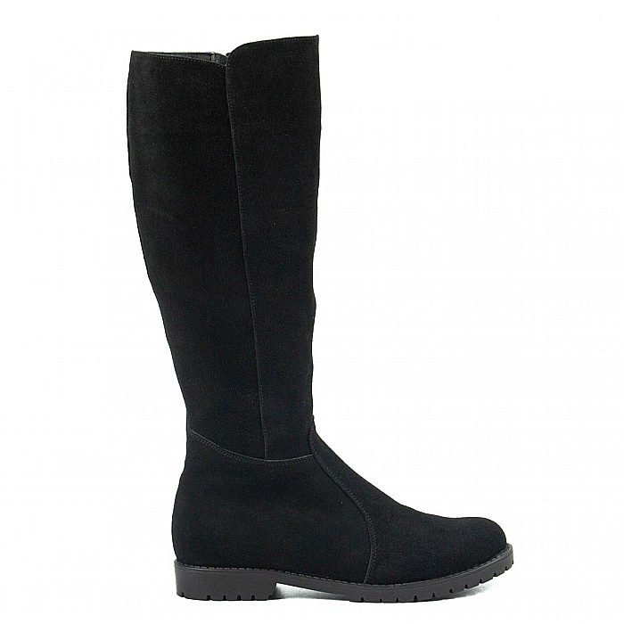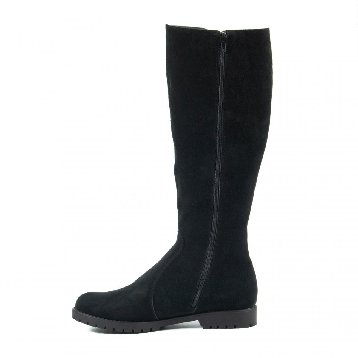 Cizme inalte din piele naturala velur negru, cu talpa joasa, antiderapanta si captuseala calda, ideale pentru vremea rece si uscata.