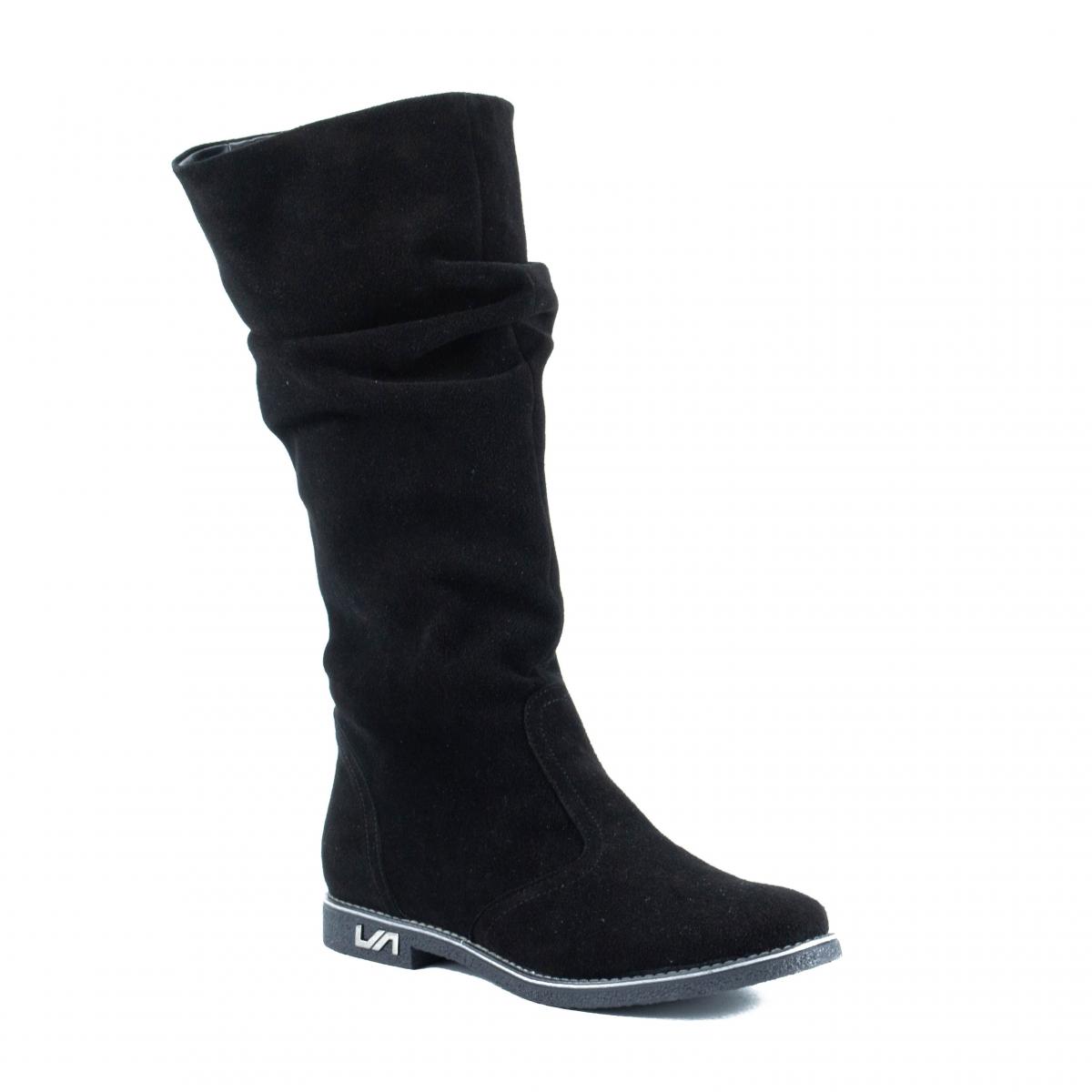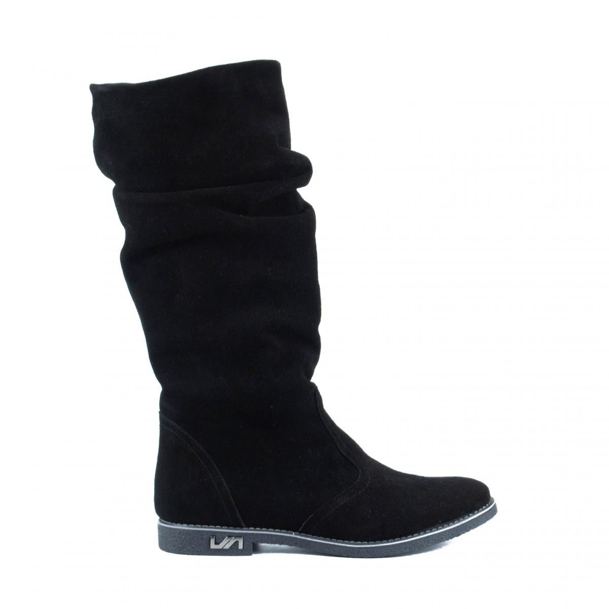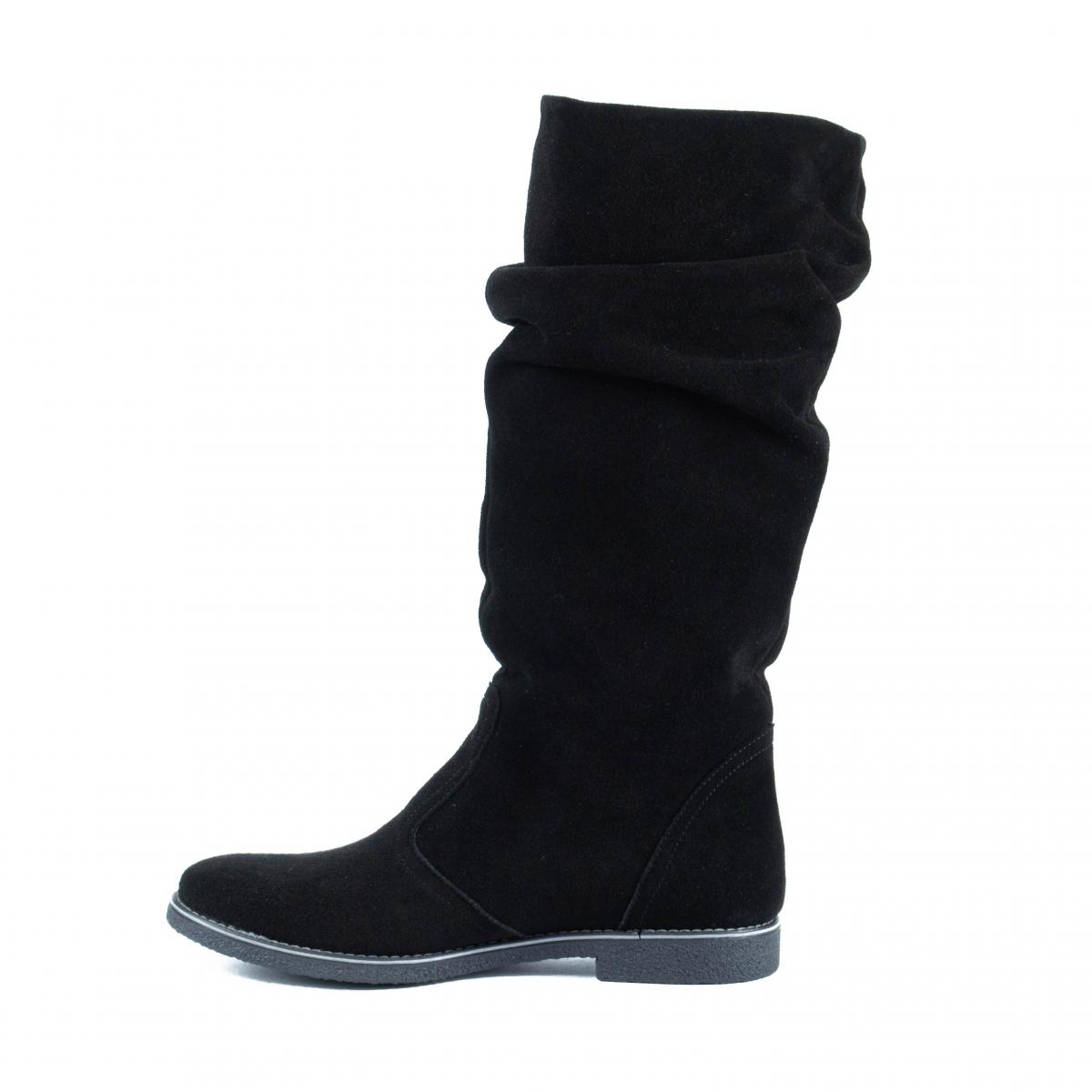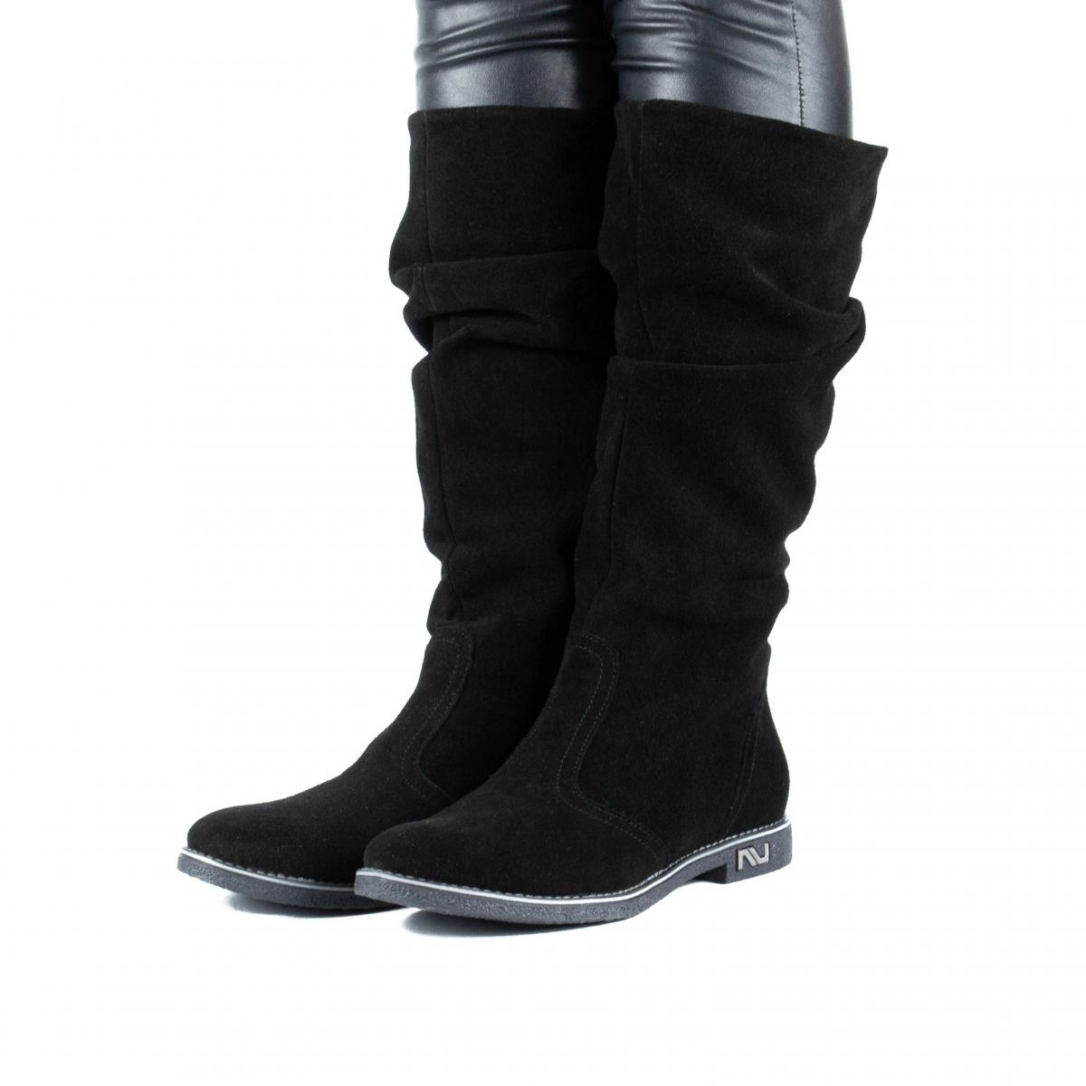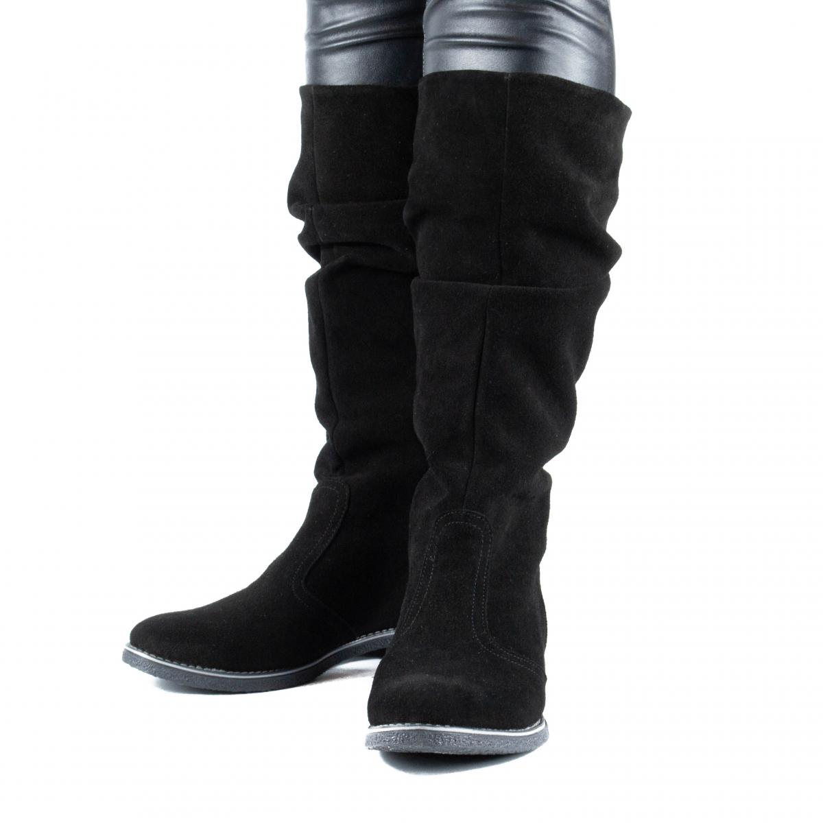 Cizme inalte din piele naturala velur negru, fronsate, fara inchidere, cu talpa joasa, antiderapanta, ce pot fi purtate la tinute casual, smart-casual, dar nu numai.