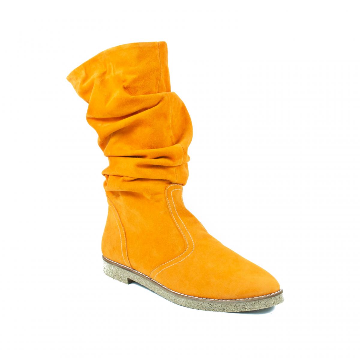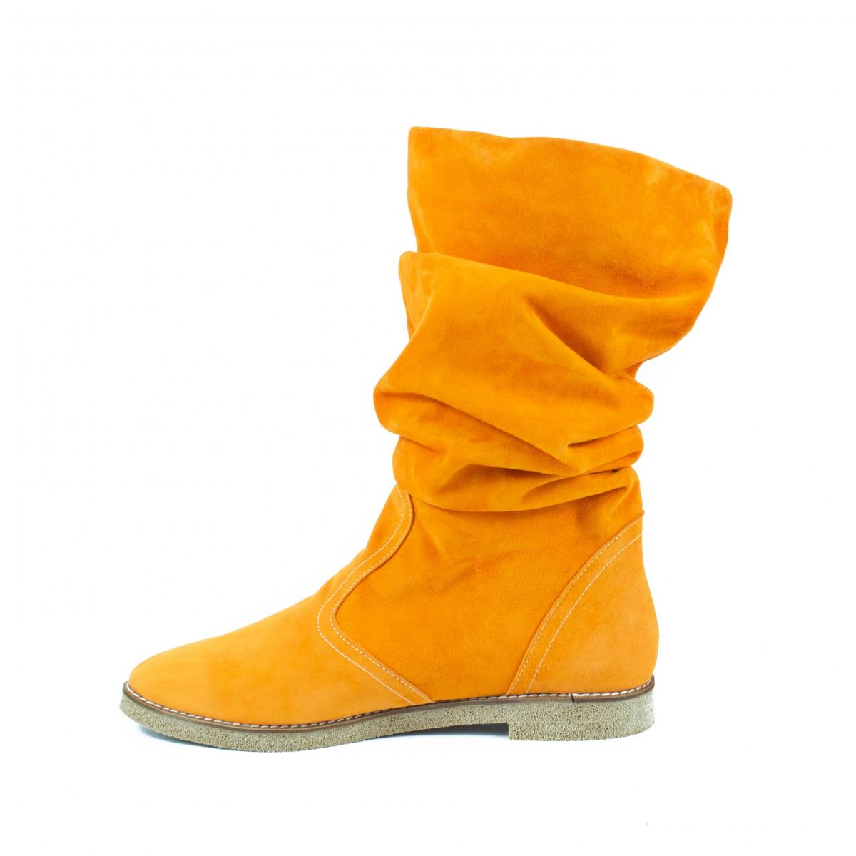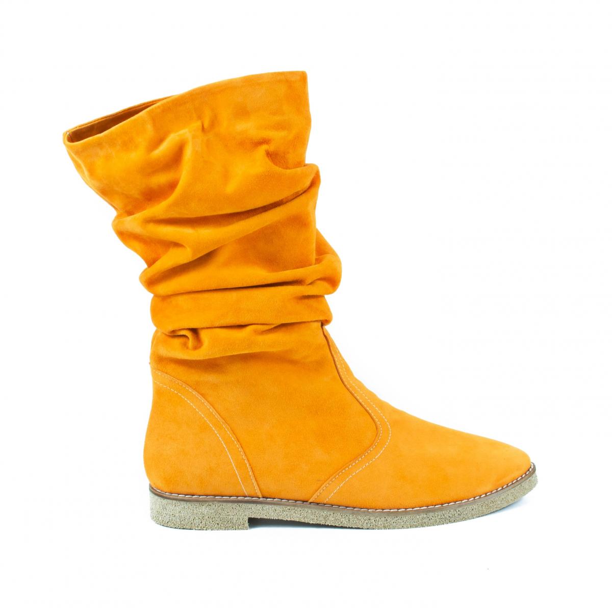 Cizme medii din piele naturala velur galben-mustar, fronsate, fara inchidere, cu talpa joasa, antiderapanta, ce pot fi purtate la tinute casual, smart-casual, dar nu numai.