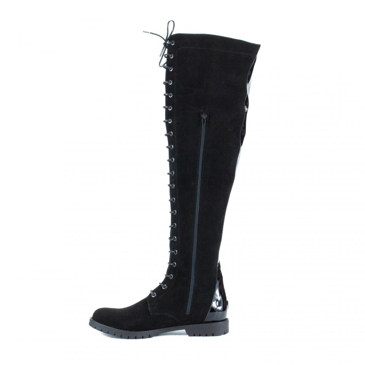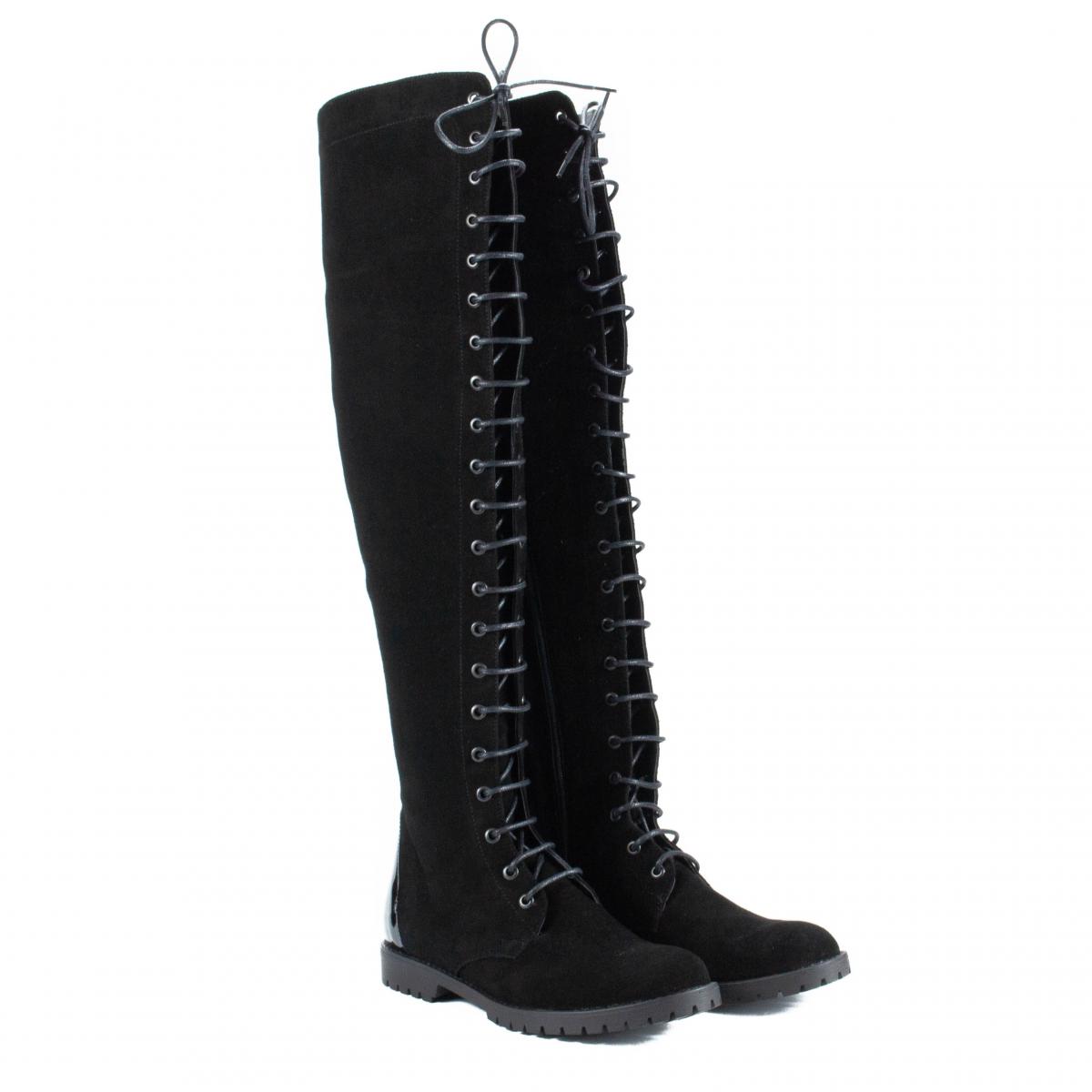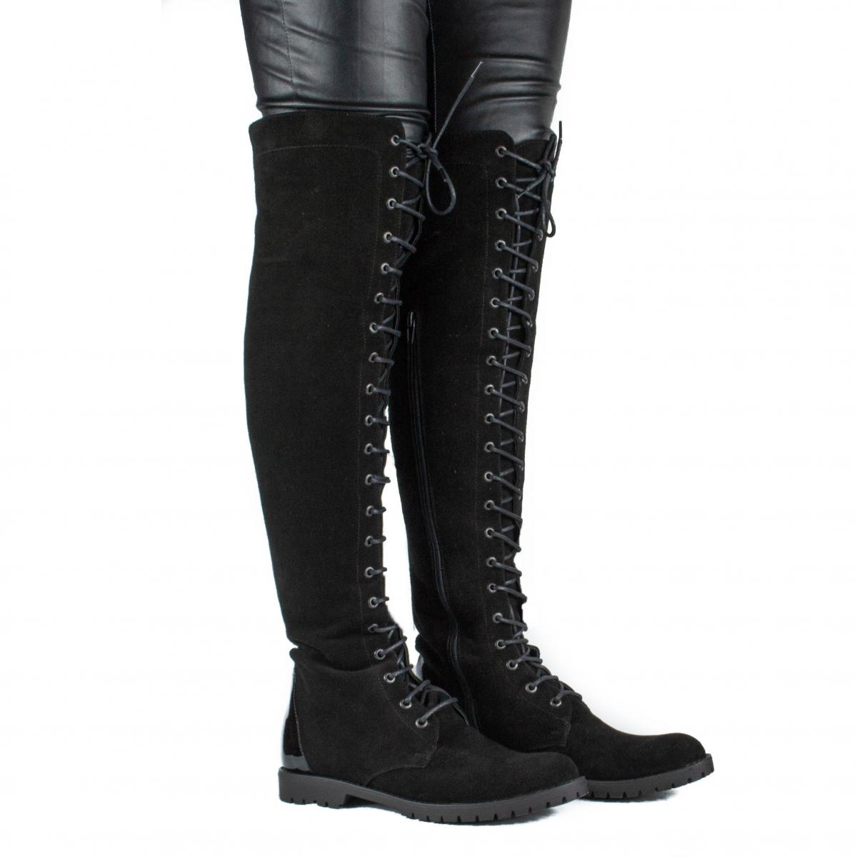 Cizme muschetar inalte peste genunchi, din piele naturala velur negru, cu talpa joasa, comoda si antiderapanta, versatile pentru diferite tinute si ideale pentru vremea rece.