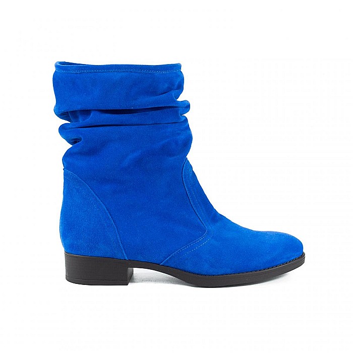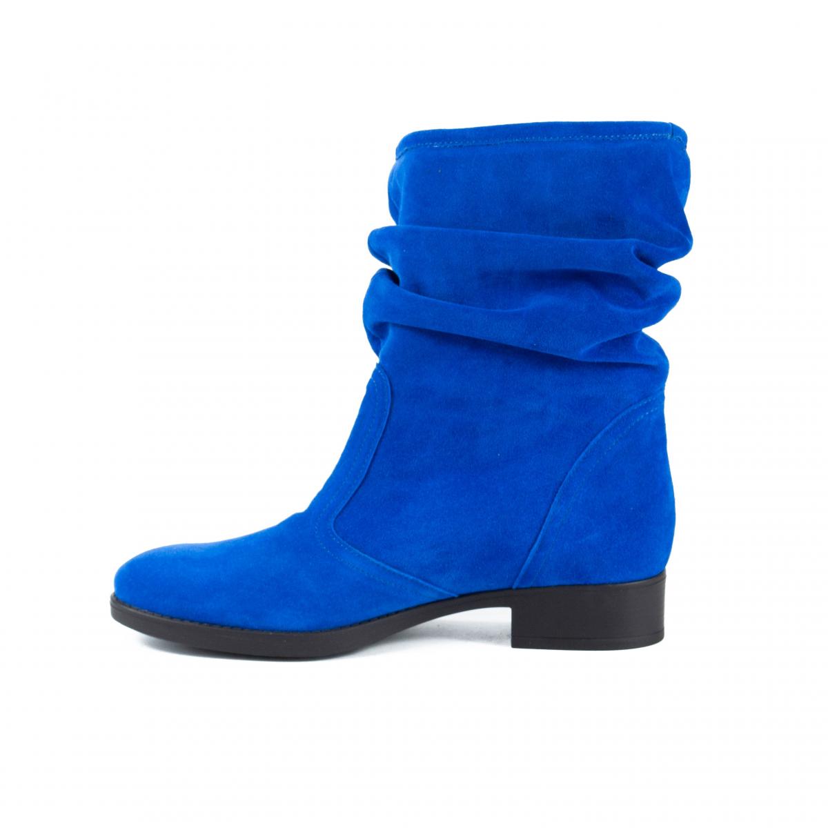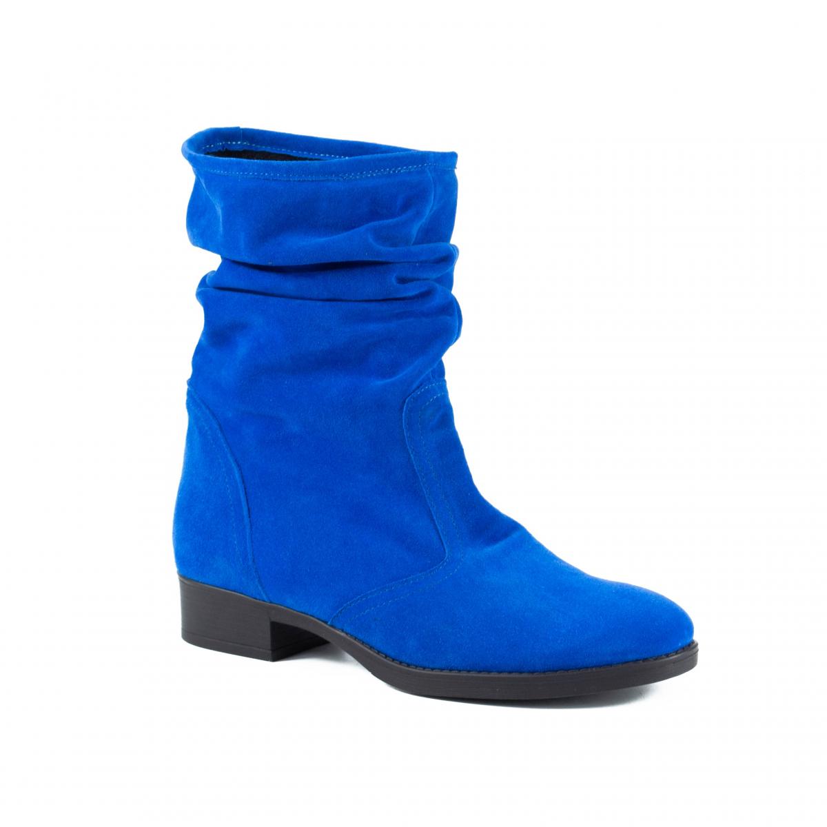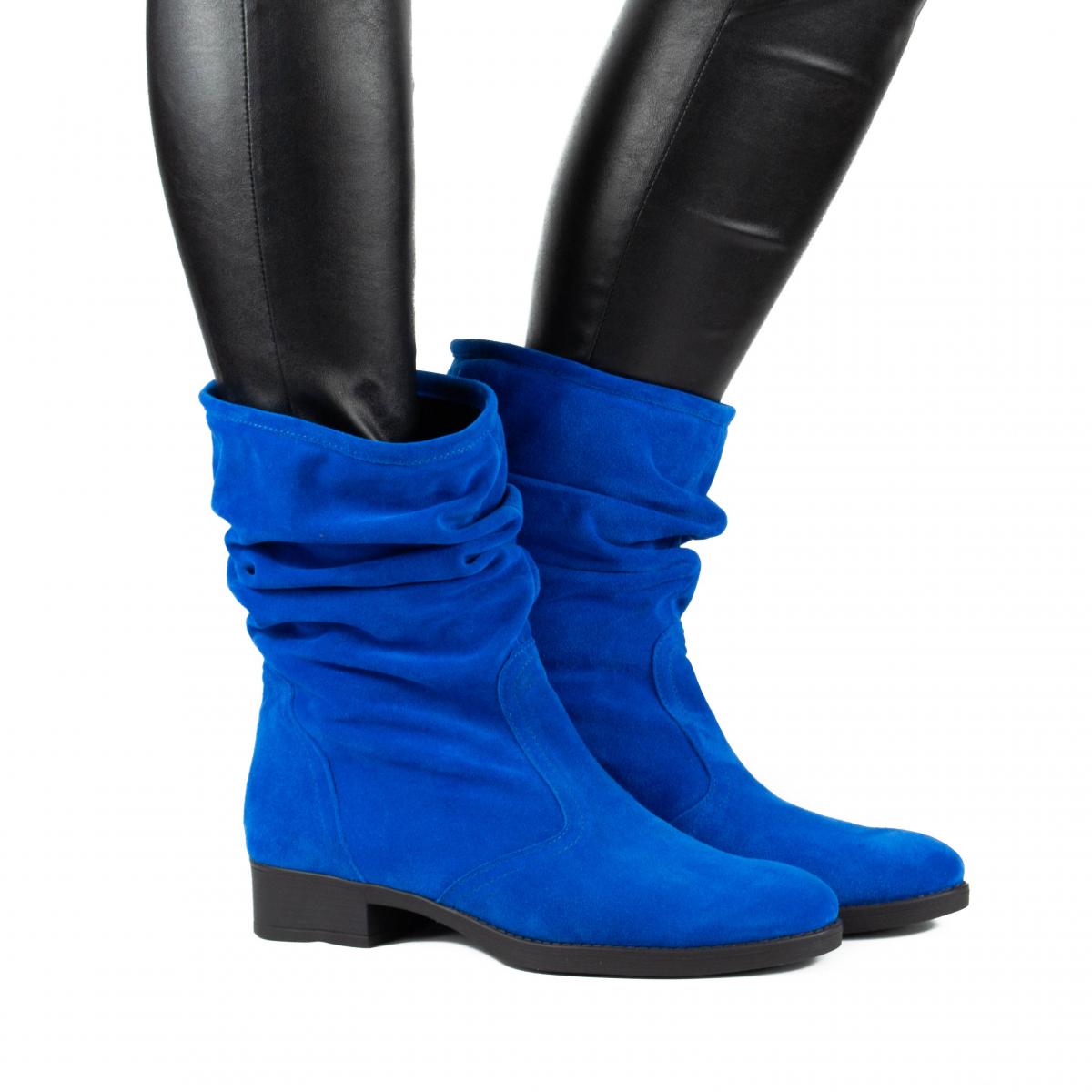 Cizme scurte din piele naturala velur albastru royal, fronsate, fara inchidere, cu talpa joasa, ce pot fi purtate la tinute casual, smart-casual, dar nu numai.