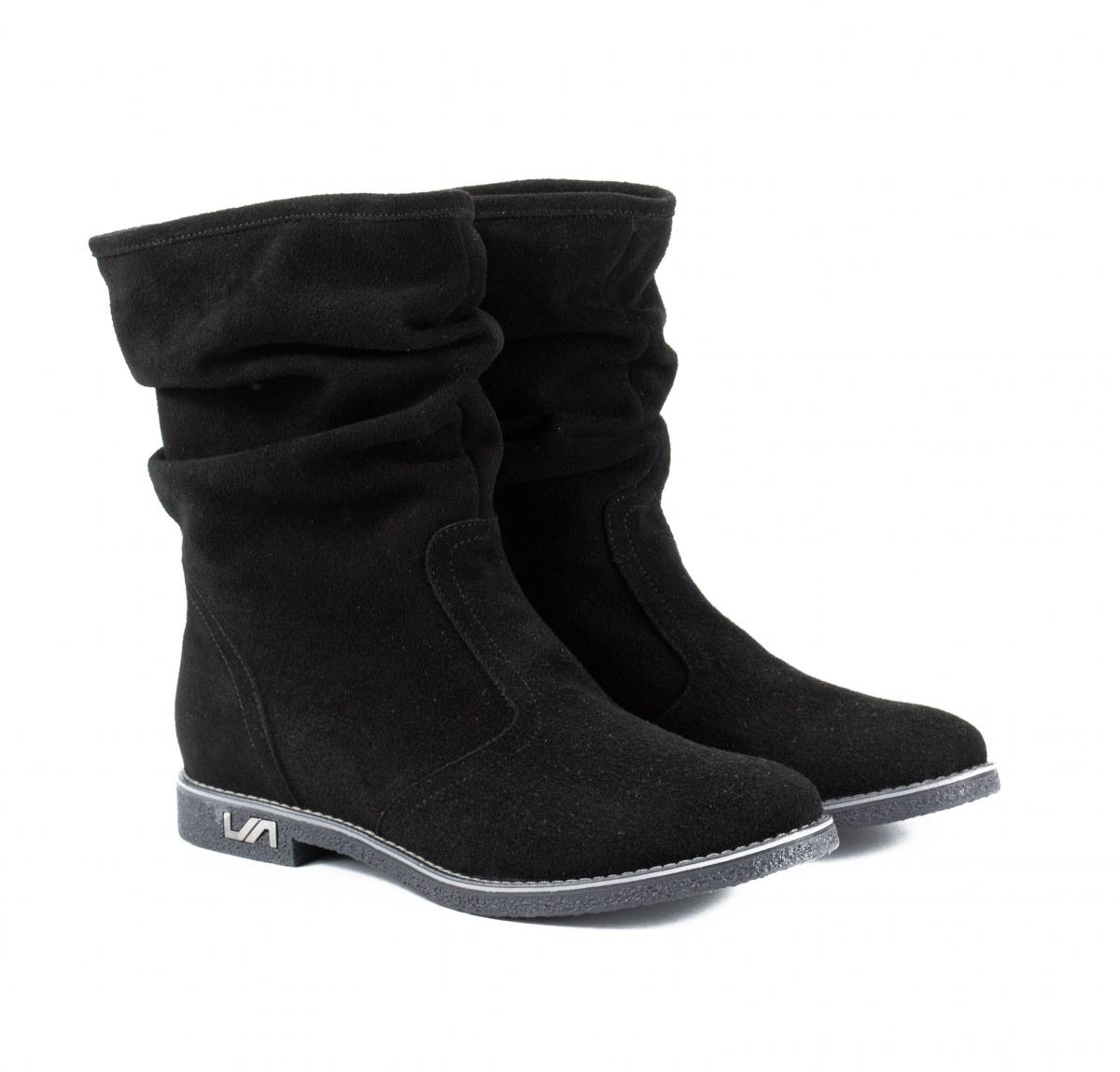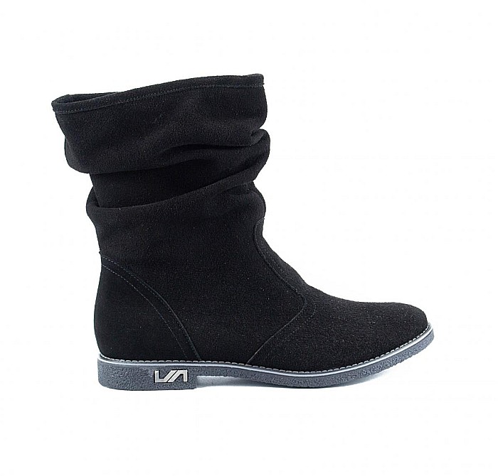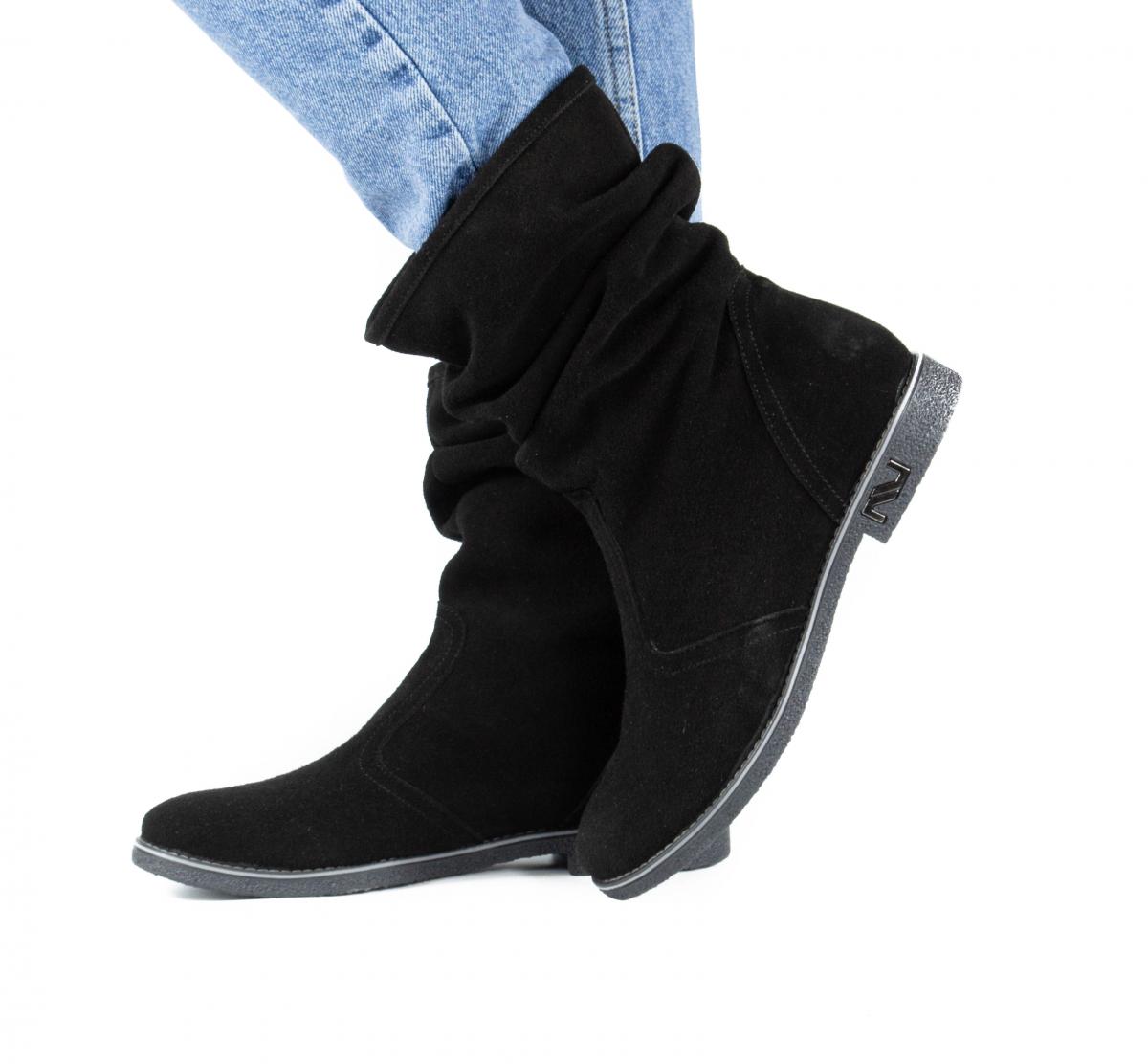 Cizme scurte din piele naturala velur negru, fronsate, fara inchidere, cu talpa joasa, ce pot fi purtate la tinute casual, smart-casual, dar nu numai.