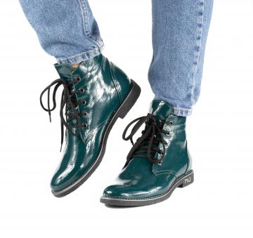 Ghete de dama casual albastru-verzui, realizate din piele naturala lucioasa, cu talpa joasa, comoda, potrivite pentru zilele cu temperaturi scazute.