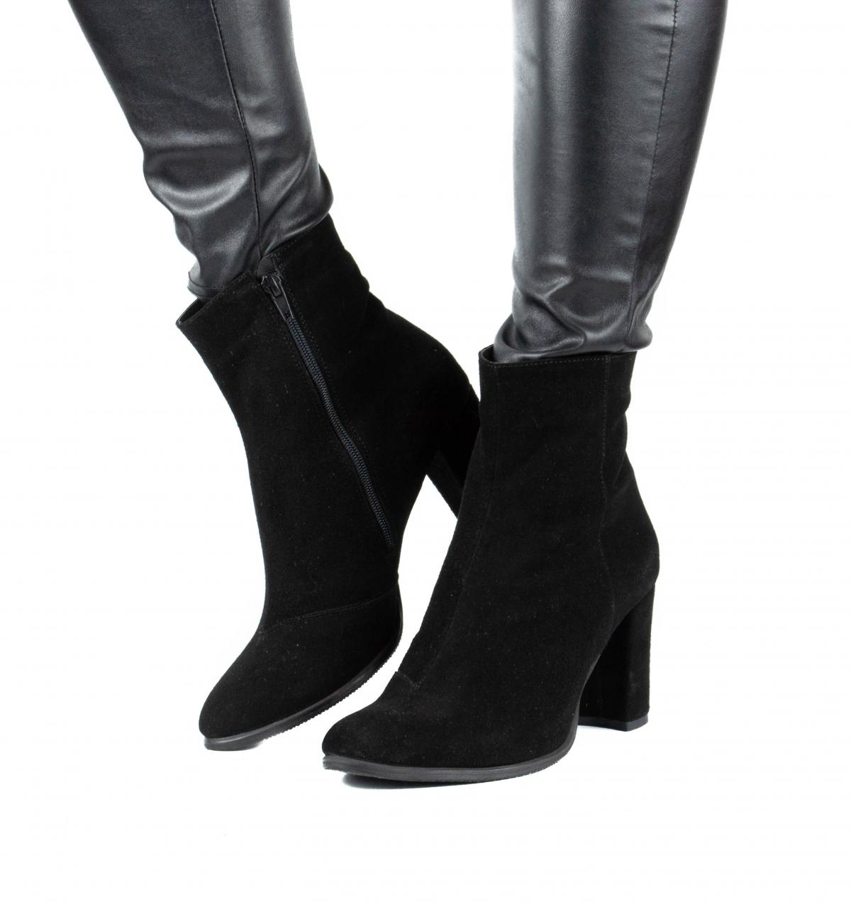 Botine clasice si elegante, realizate din piele naturala velur negru, cu toc gros, ce pot fi purtate la tinute clasice, smart-casual, office, dar nu numai.