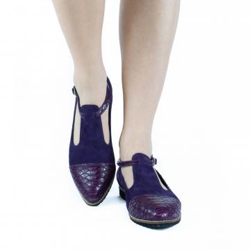 Pantofi de dama din piele naturala mov de inalta calitate, de tip velur combinata cu piele imitatie de reptila, extrem de usori si confortabili, potriviti pentru tinute casual, smart-casual sau office.
