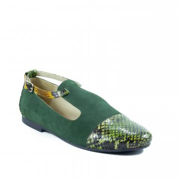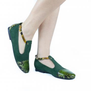 Pantofi de dama din piele naturala de inalta calitate de tip velur verde combinata cu piele naturala imitatie reptila, extrem de usori si confortabili, potriviti pentru tinute casual, smart-casual sau office.