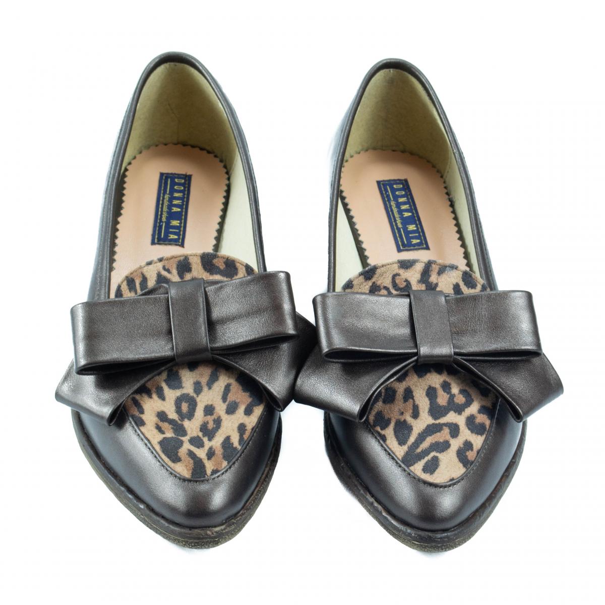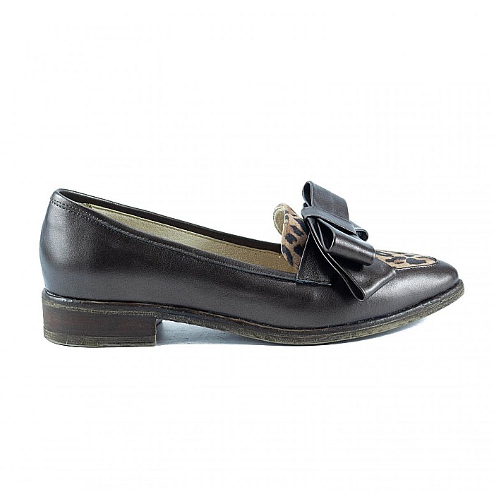 Mocasini casual din piele naturala animal print cu maro, accesorizati cu fundita, ce pot fi purtati impreuna cu tinute casual, smart-casual sau office.