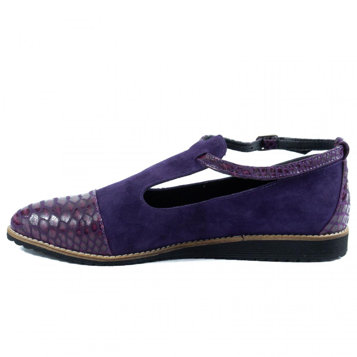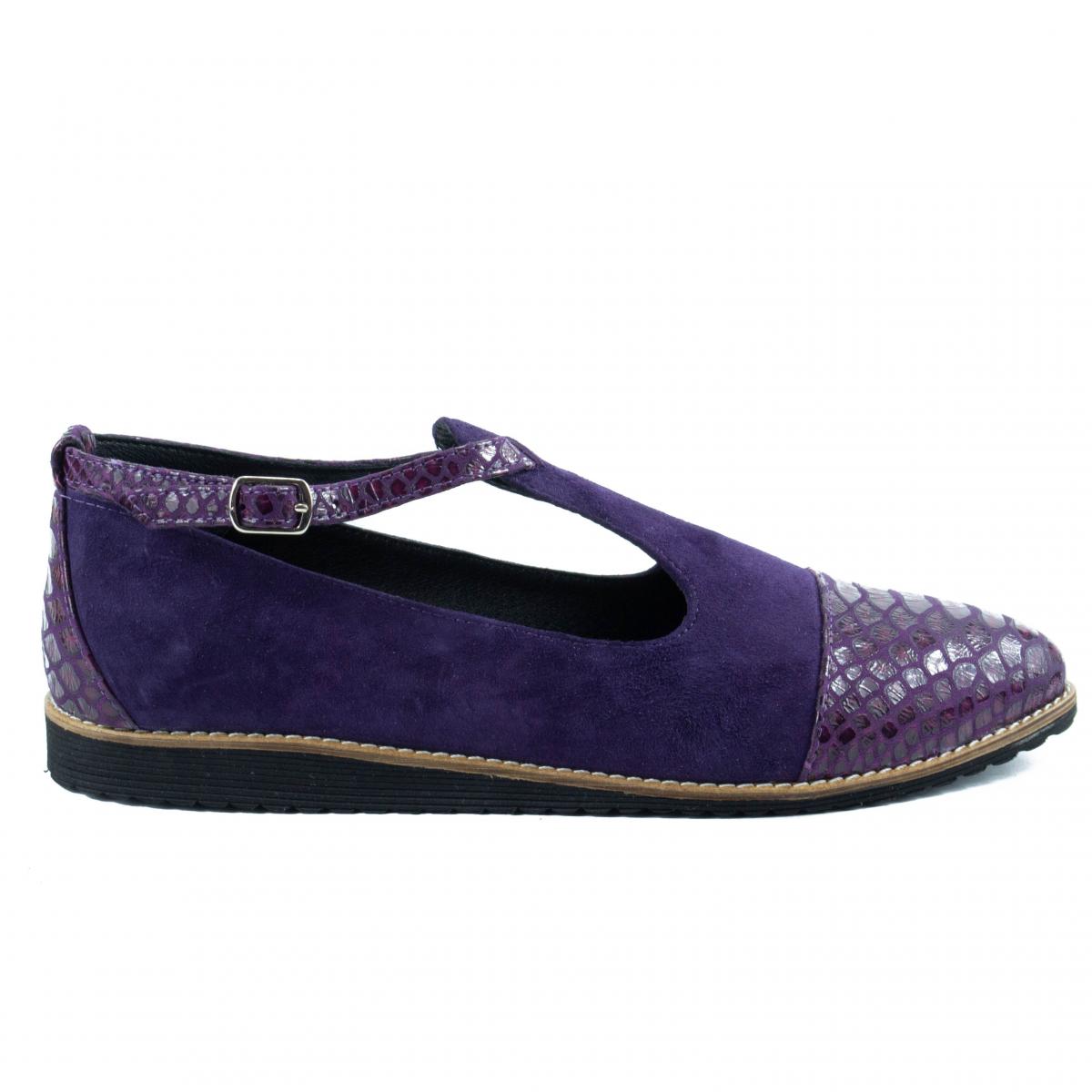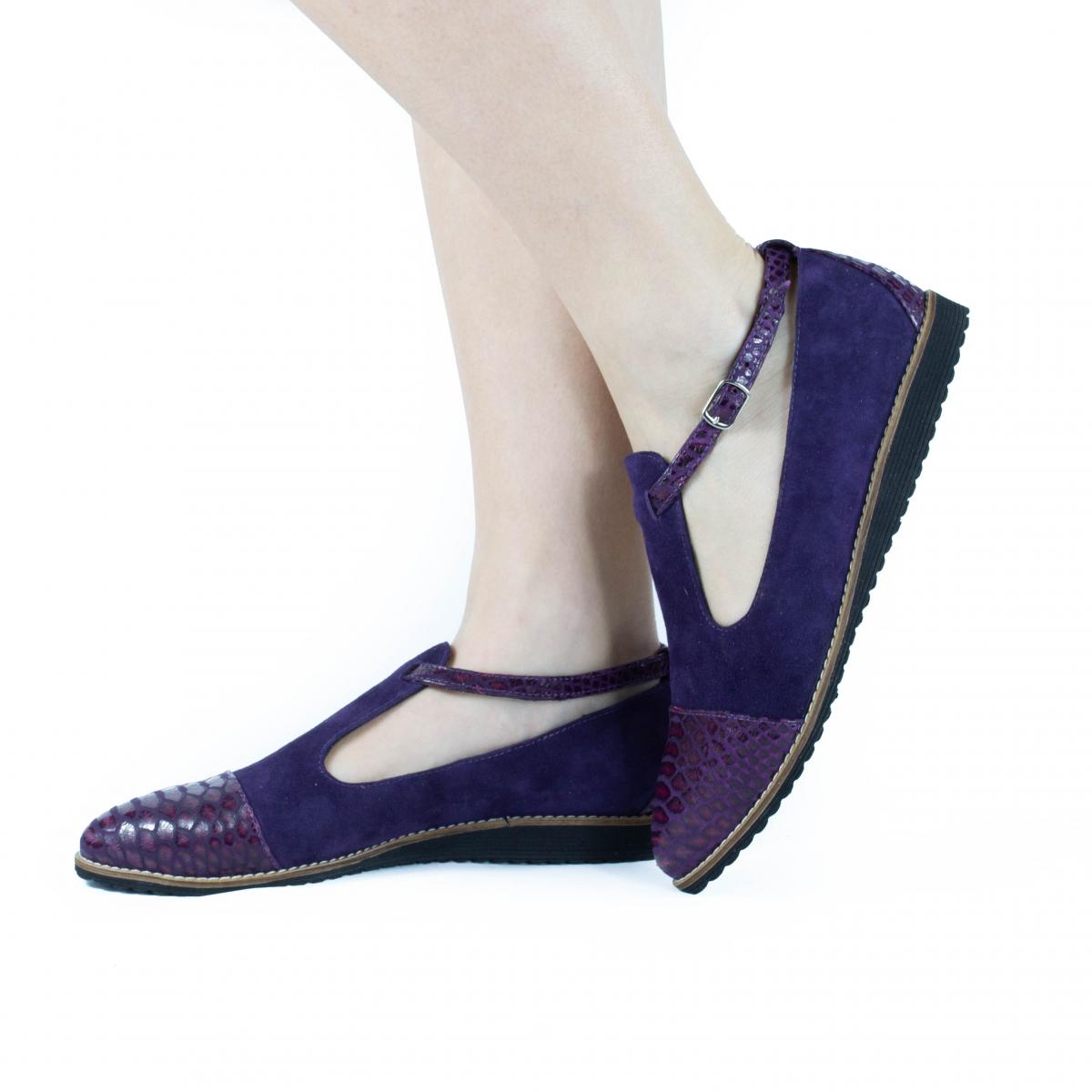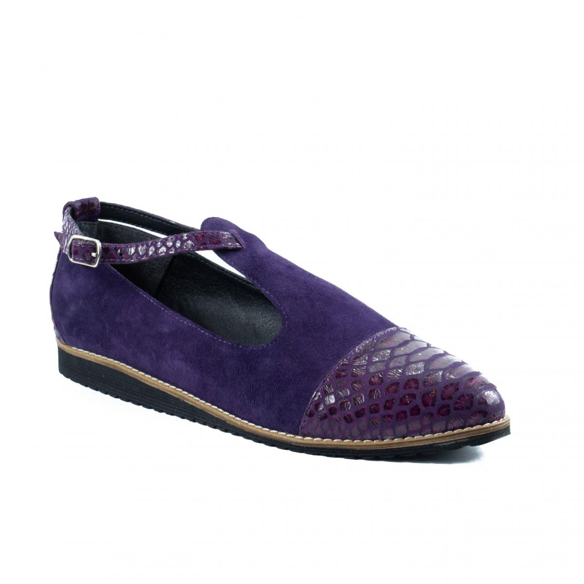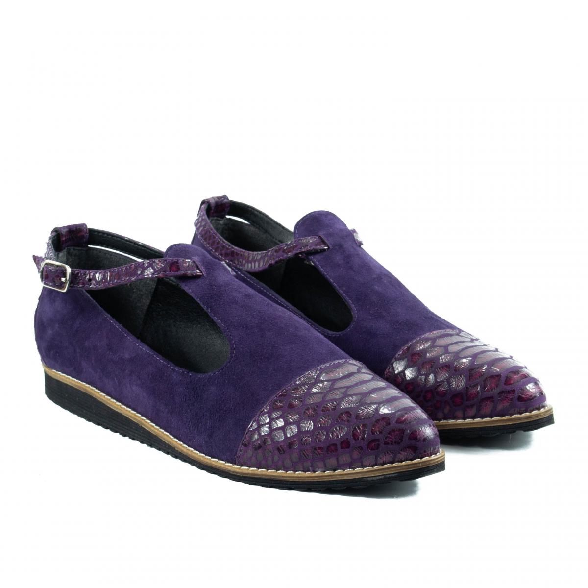 Pantofi de dama din piele naturala mov de inalta calitate, de tip velur combinata cu piele imitatie de reptila, extrem de usori si confortabili, potriviti pentru tinute casual, smart-casual sau office.
