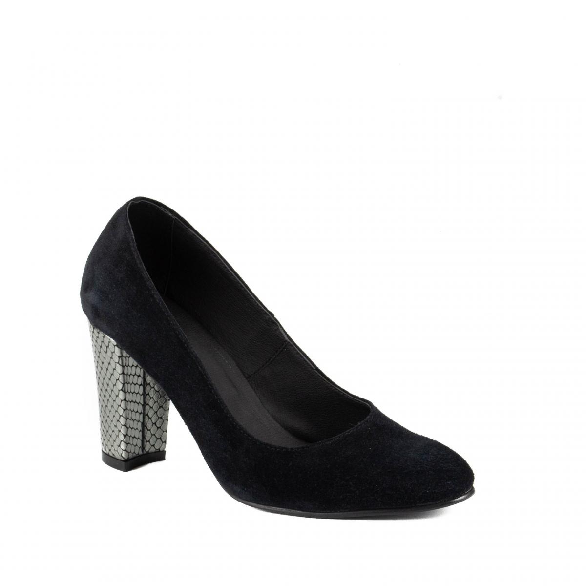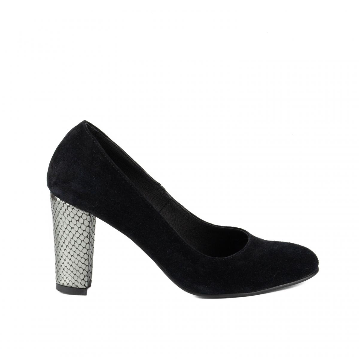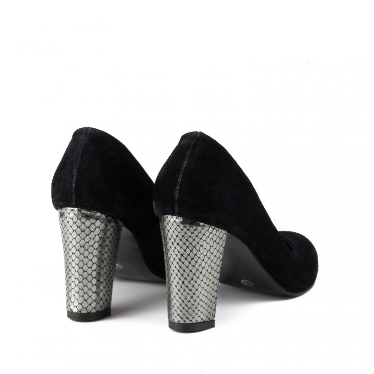 Pantofi clasici, din piele naturală velur foarte fină, cu toc îmbrăcat în piele croco argintiu, ce pot fi purtați împreună cu ținute elegante sau office.