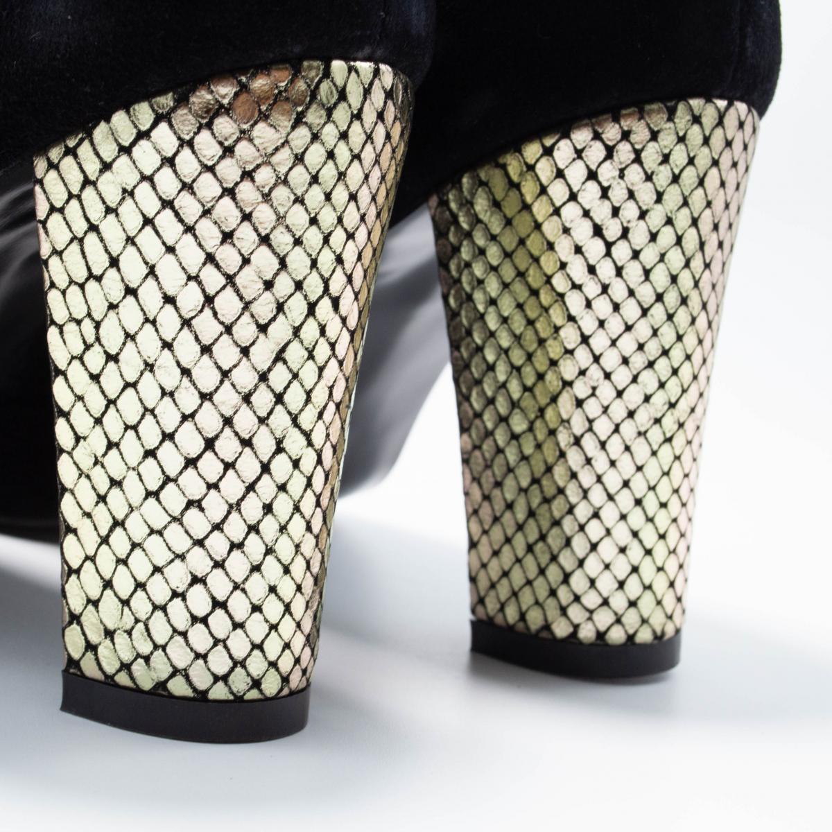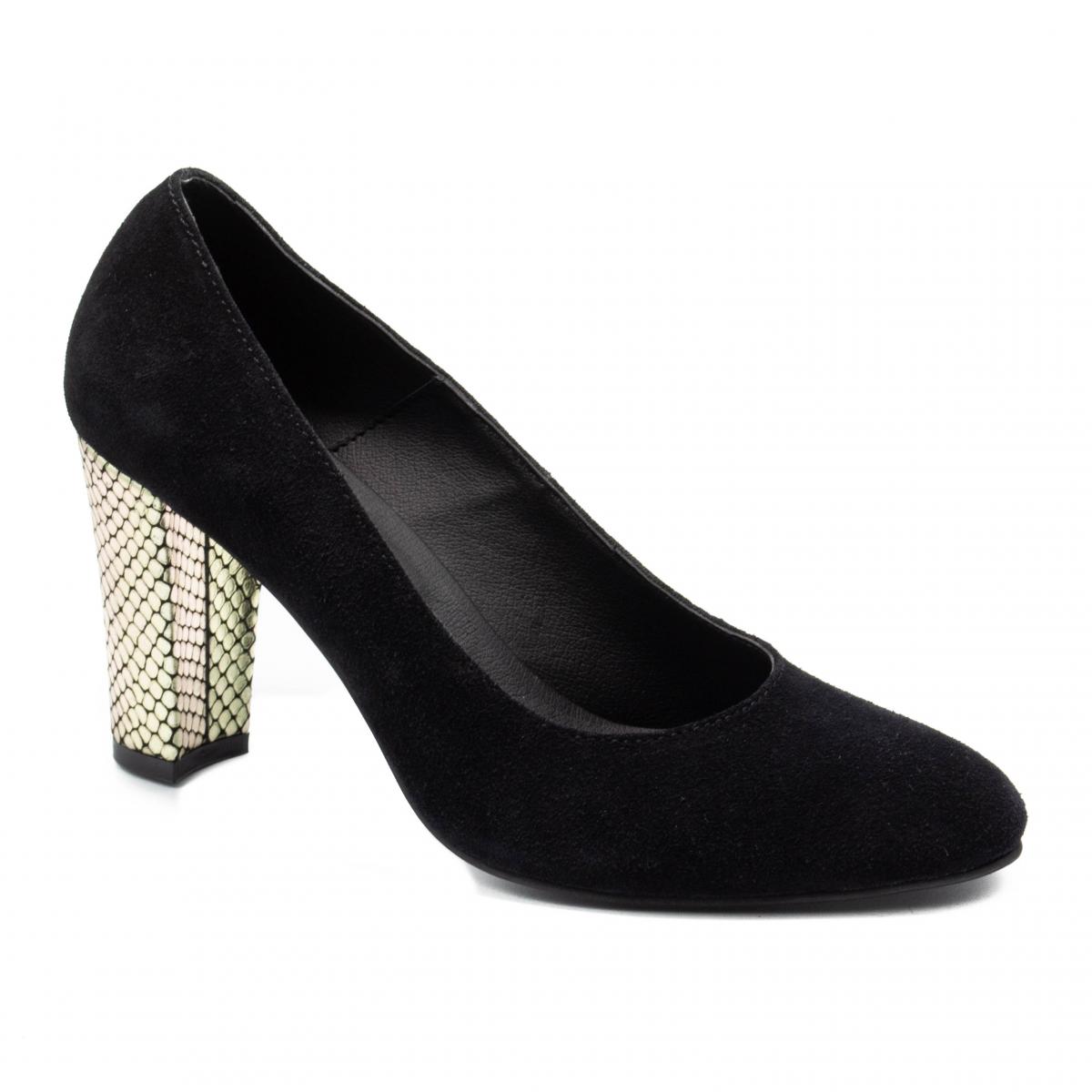 Pantofi clasici, din piele naturală velur foarte fină, cu toc îmbrăcat în piele croco auriu, ce pot fi purtați împreună cu ținute elegante sau office.