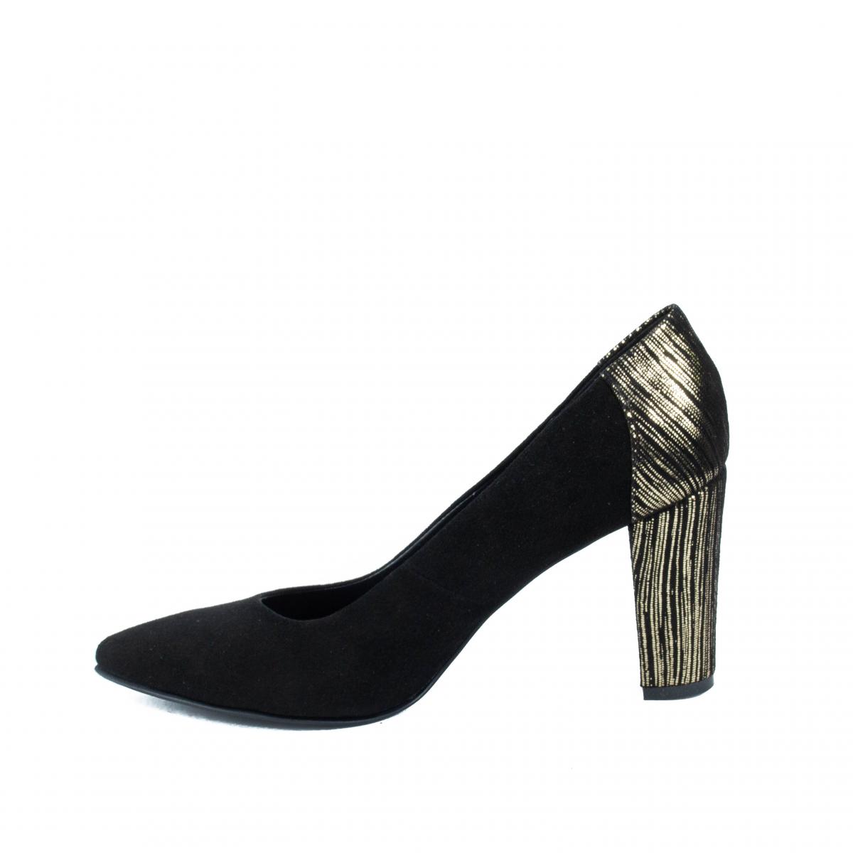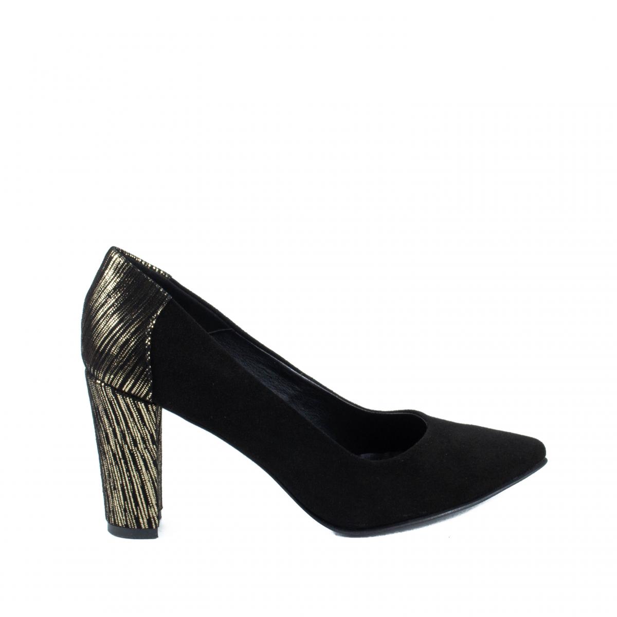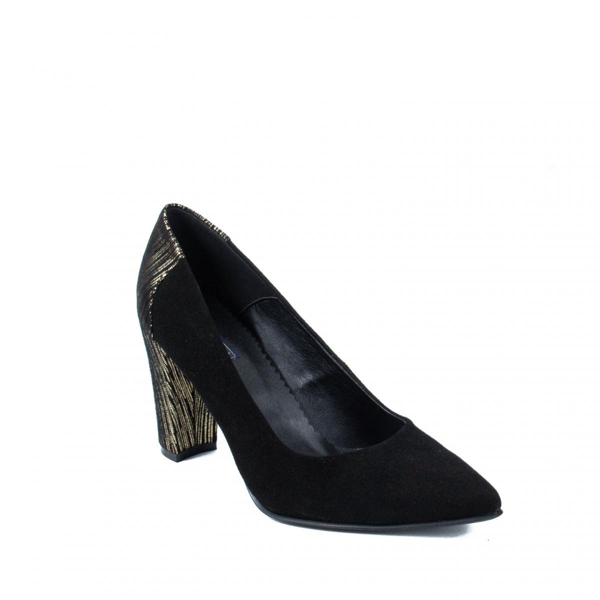 Pantofi pumps din piele naturala velur negru si toc imbracat in piele texturata aurie, eleganti si comozi, ce pot fi purtati impreuna cu tinute office sau elegante.