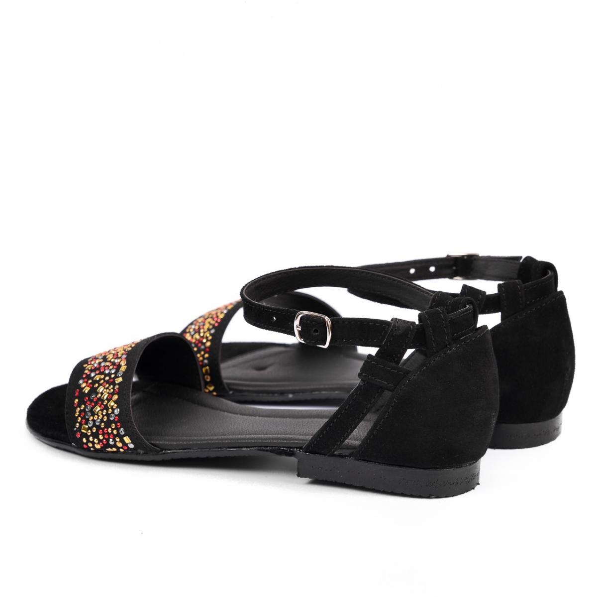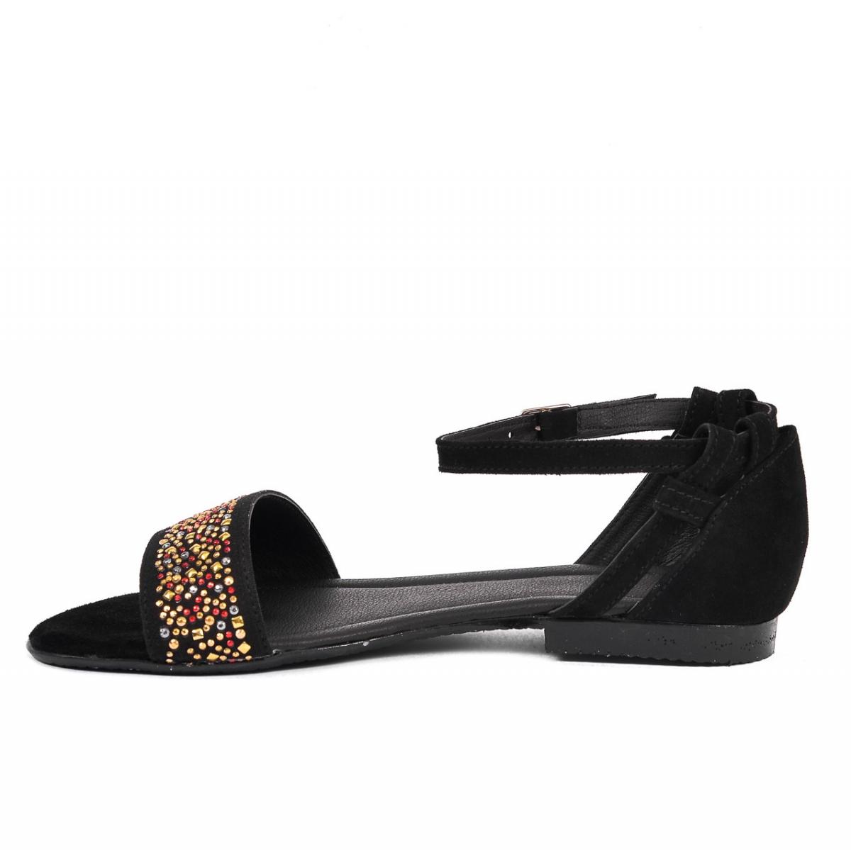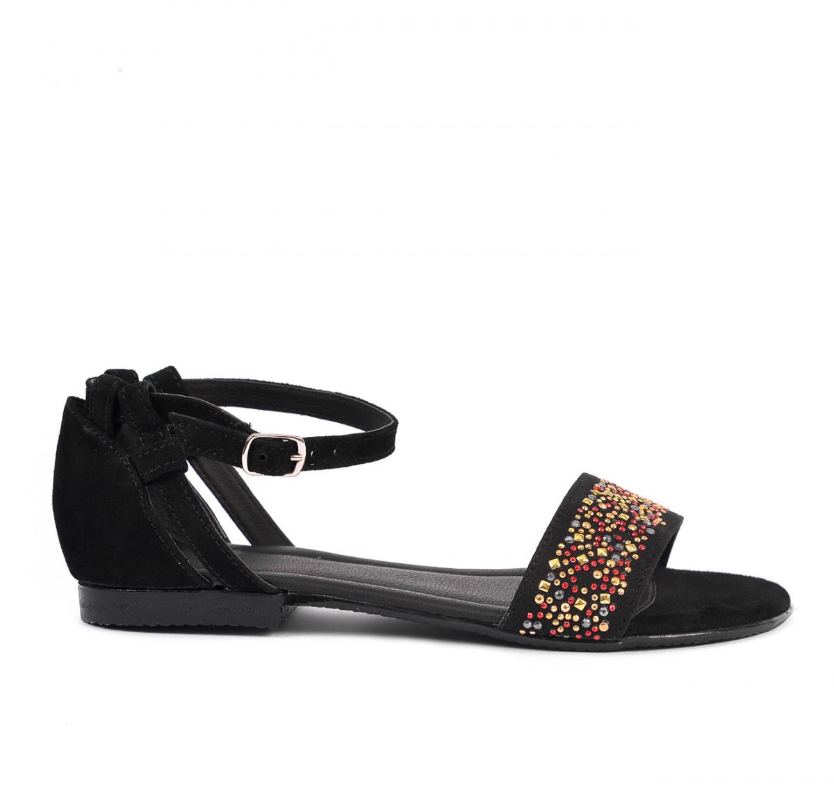Sandale flat din piele naturală, foarte confortabile, cu aplicații metalice colorate și baretă peste gleznă, ce pot fi purtate la ținute casual, smart-casual, dar nu numai.